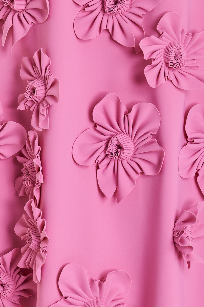 - High neckline. 3D flower. sleeveless. solid color. pink. maxi dress