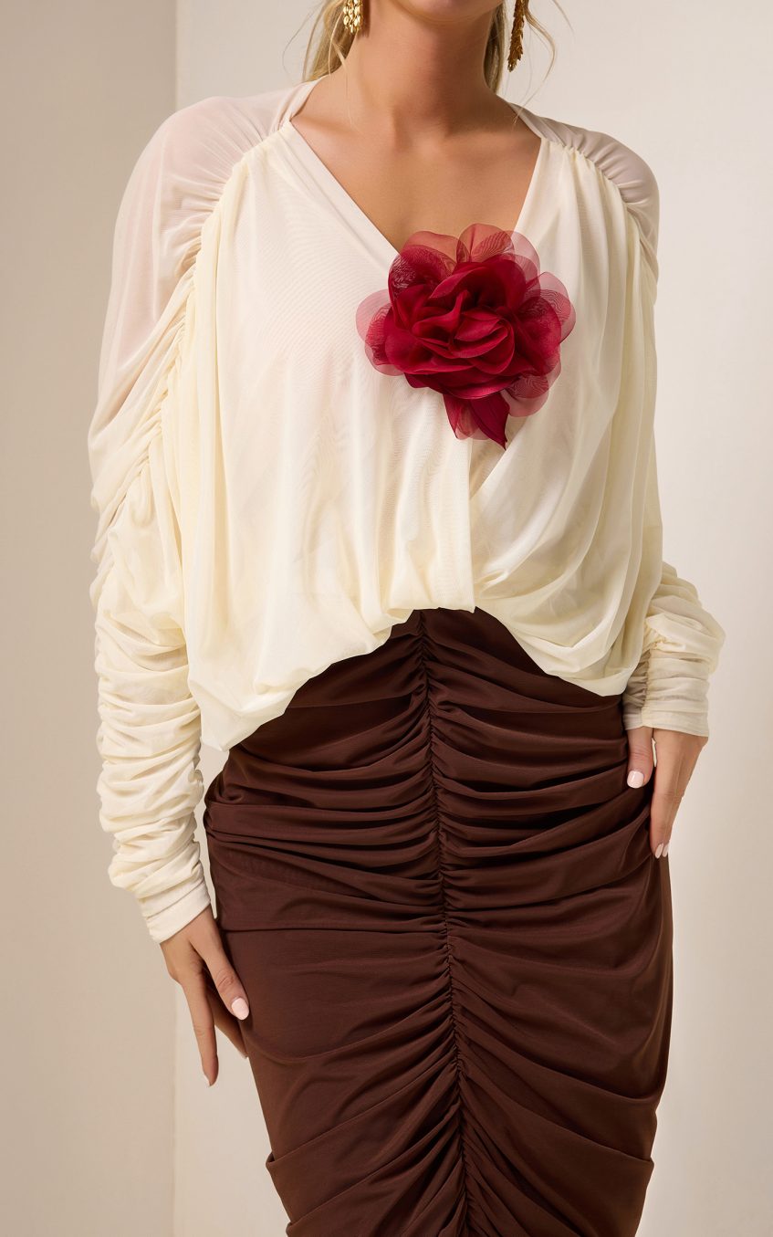 - Long sleeve. apricot. 3D flower. brown. shirring. v-neck. midi dress