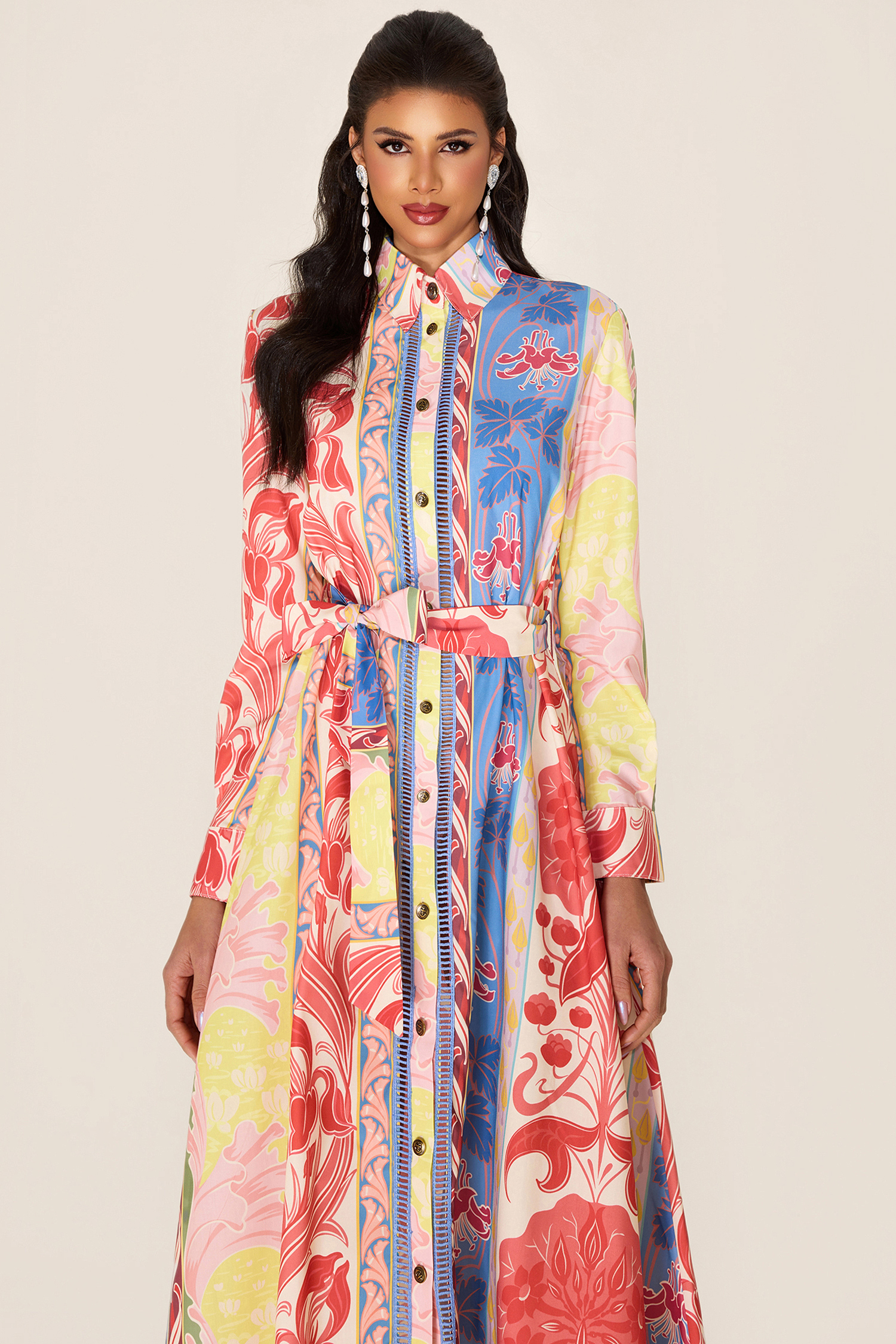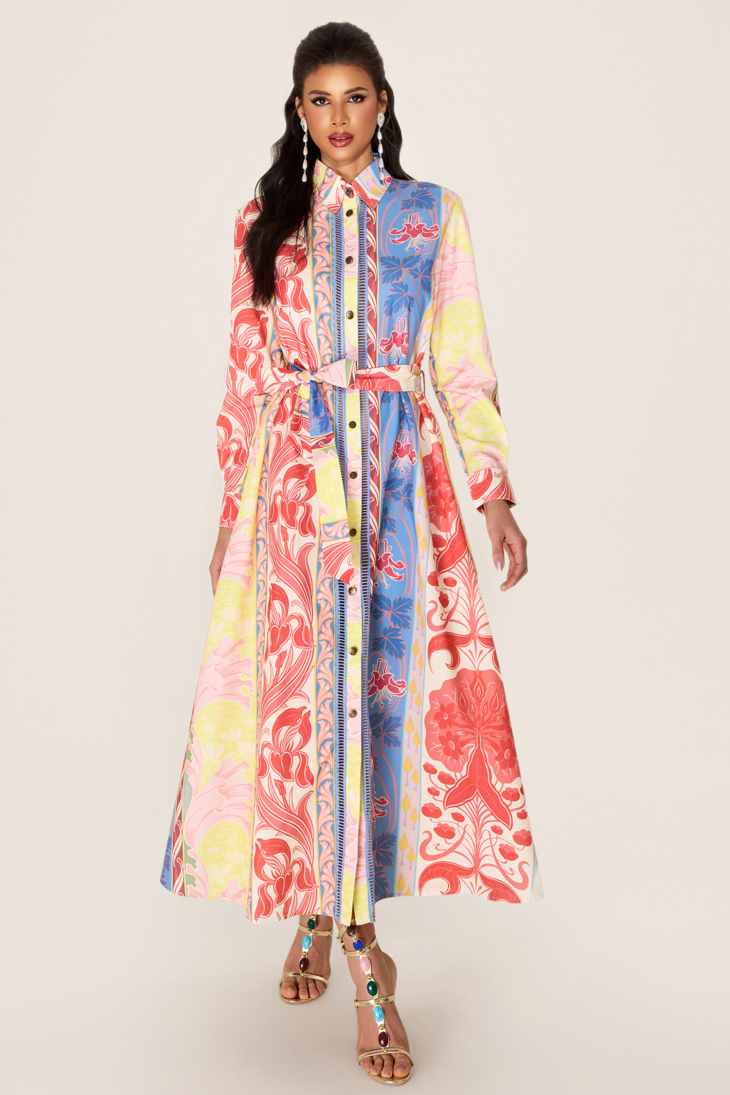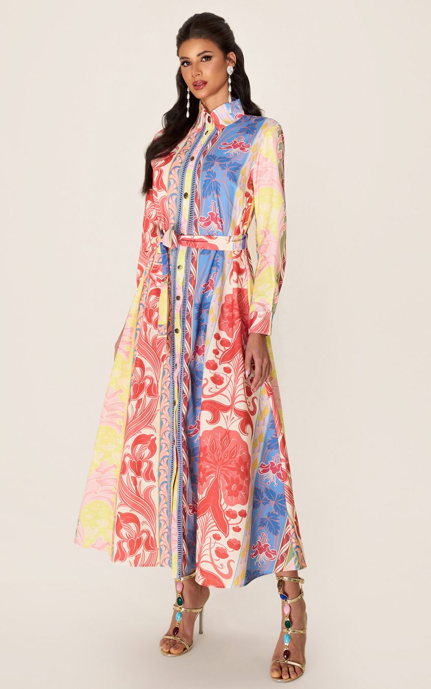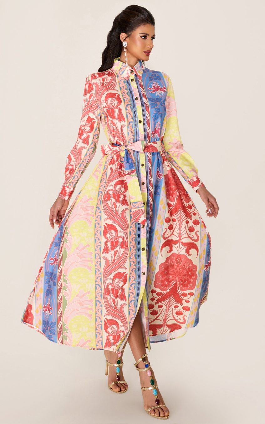 - Long sleeve. botanical print. multi color. midi dress. with belt