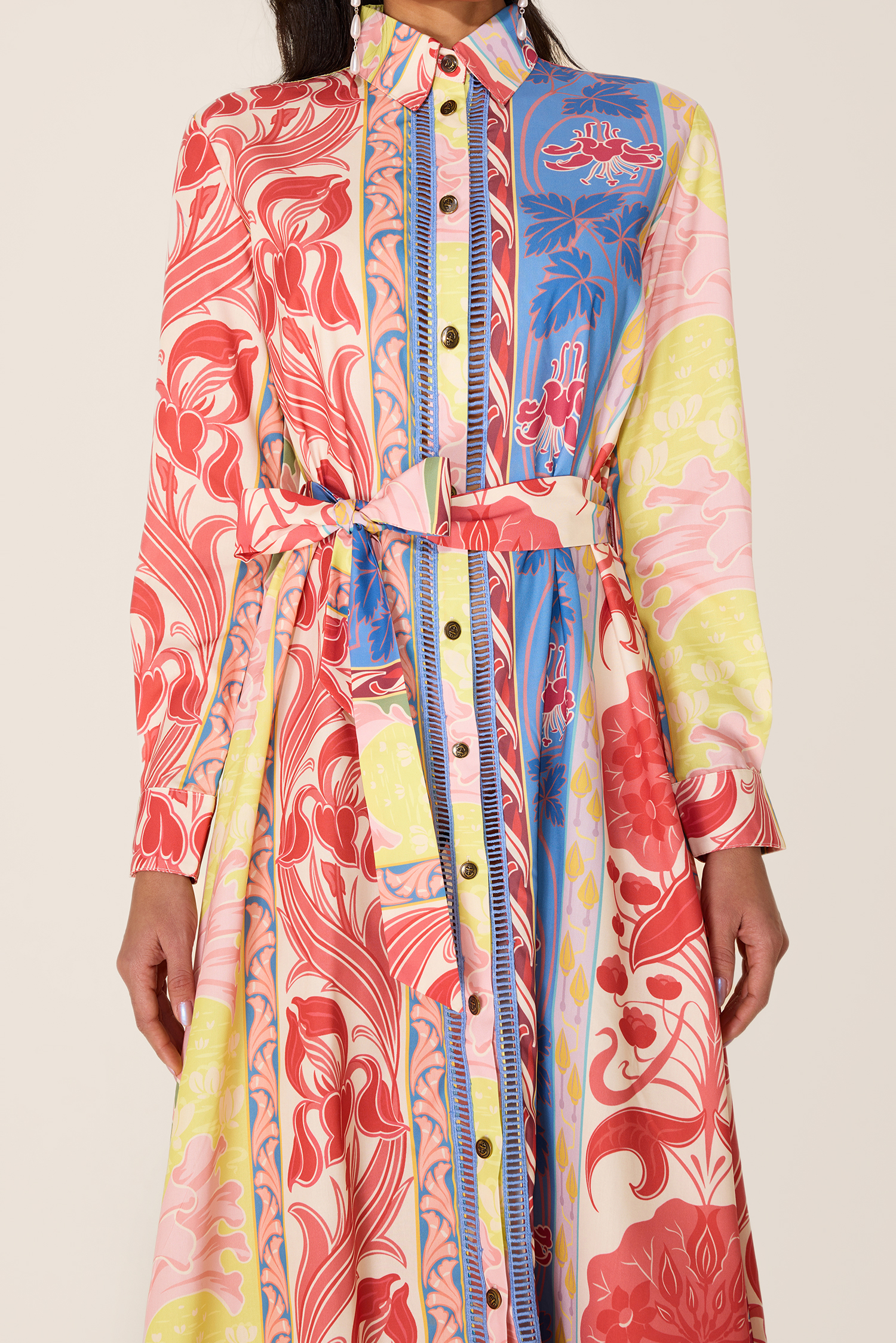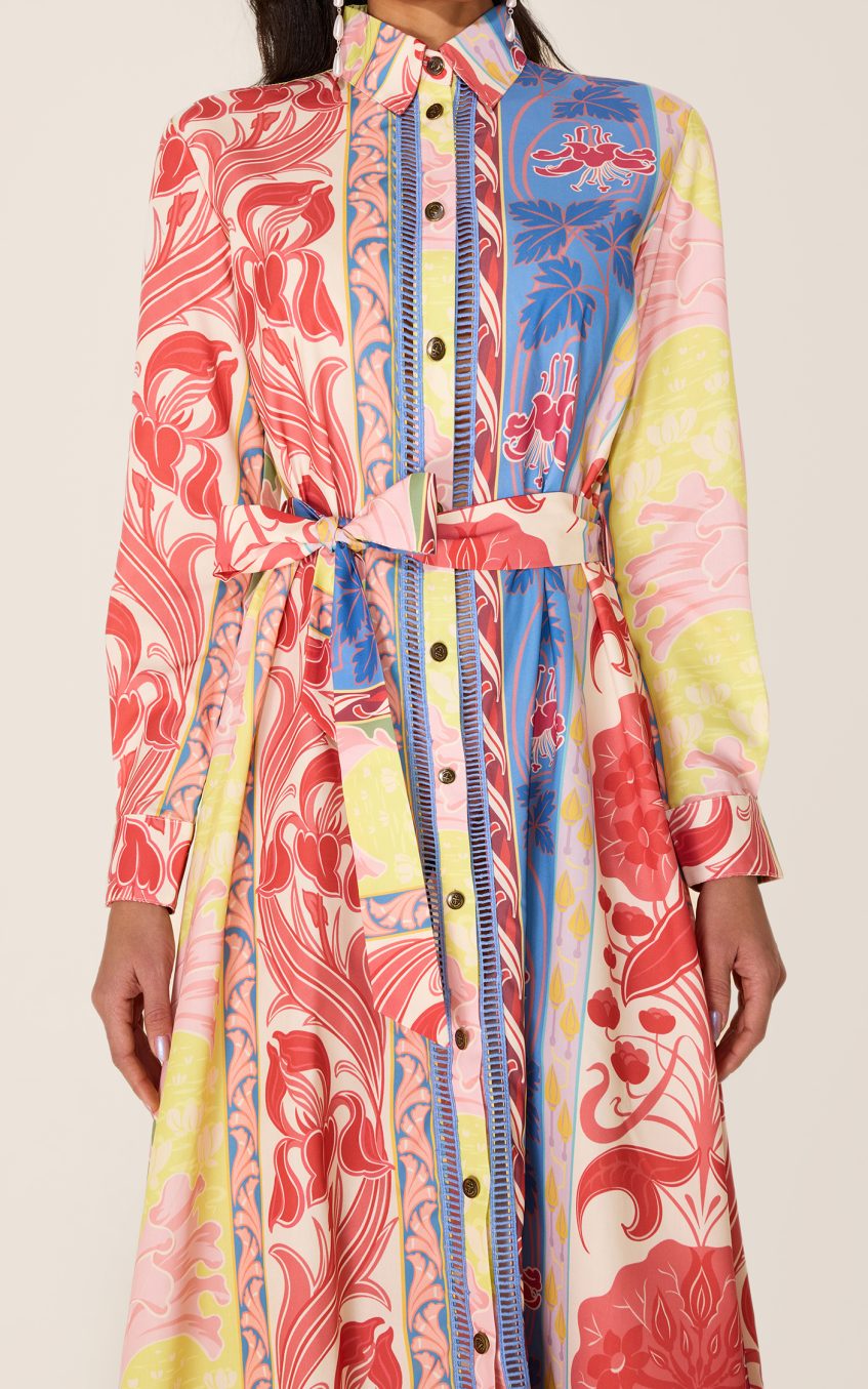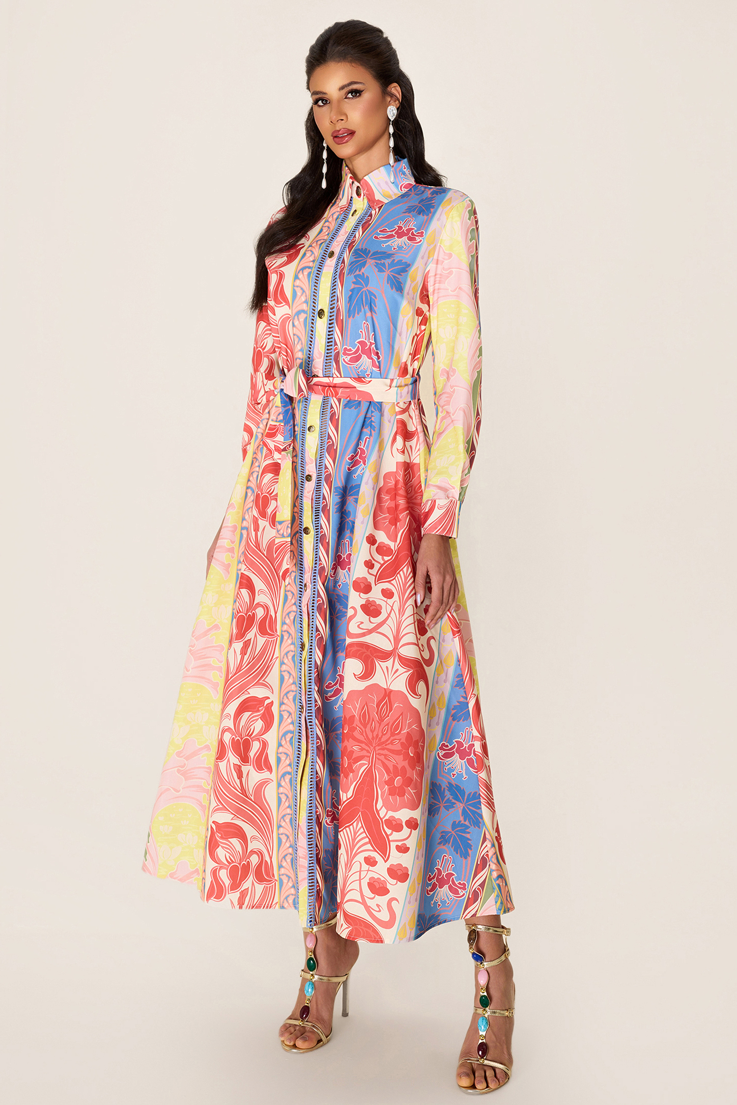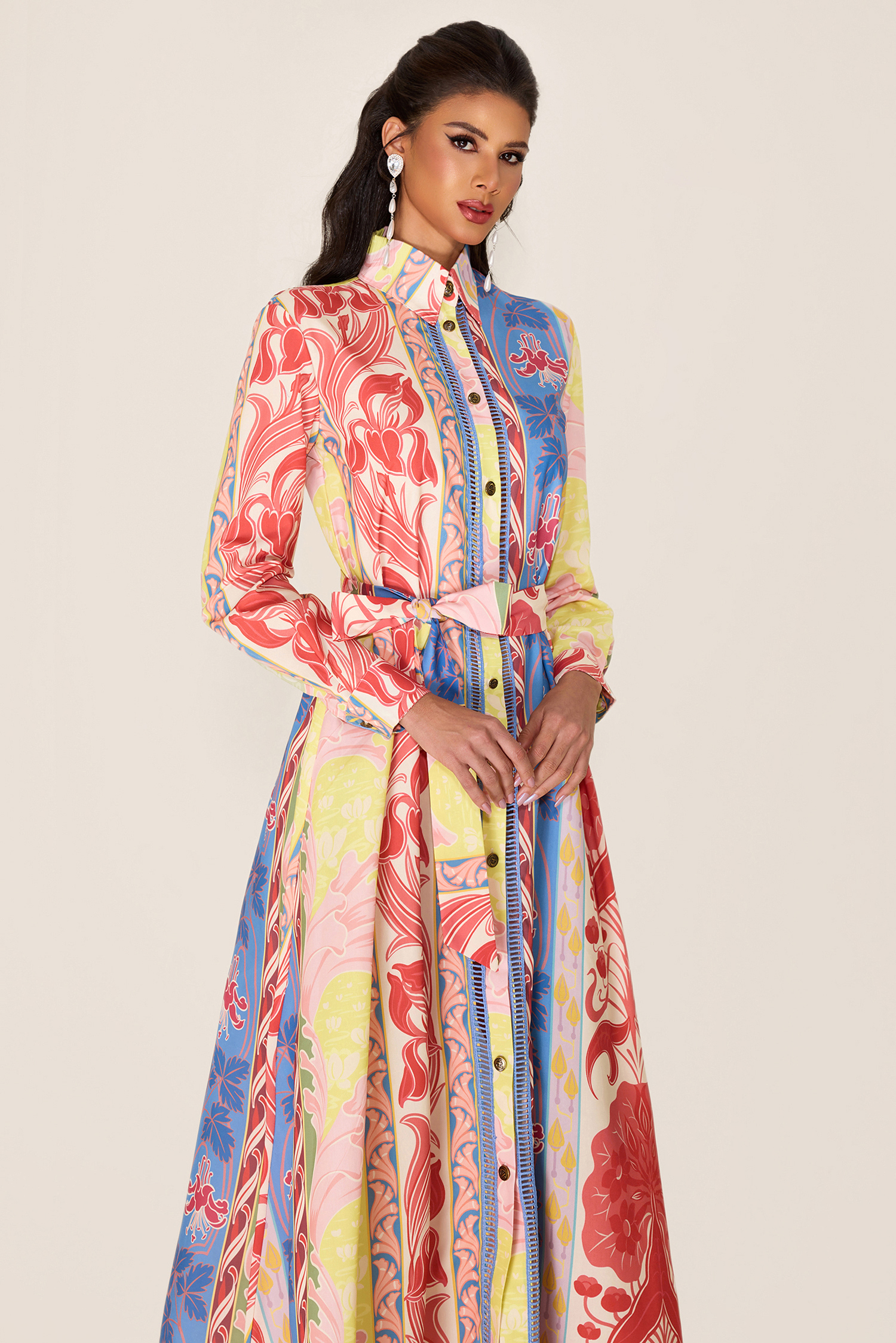 - Long sleeve. botanical print. multi color. midi dress. with belt