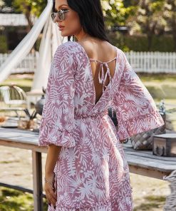 Floral V-Neck Mid Sleeve Backless Lace Up Ruffle Hem Mini Dress