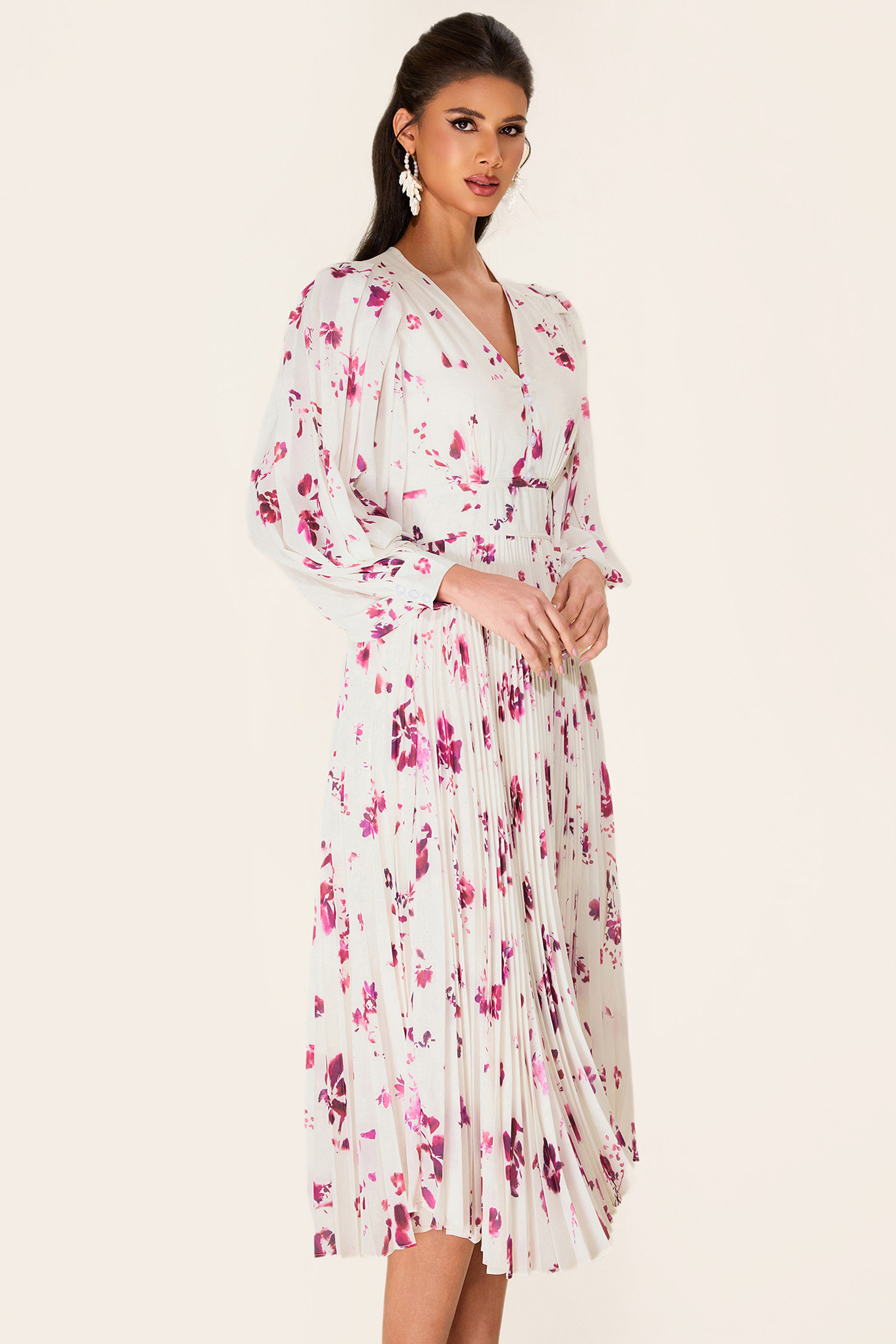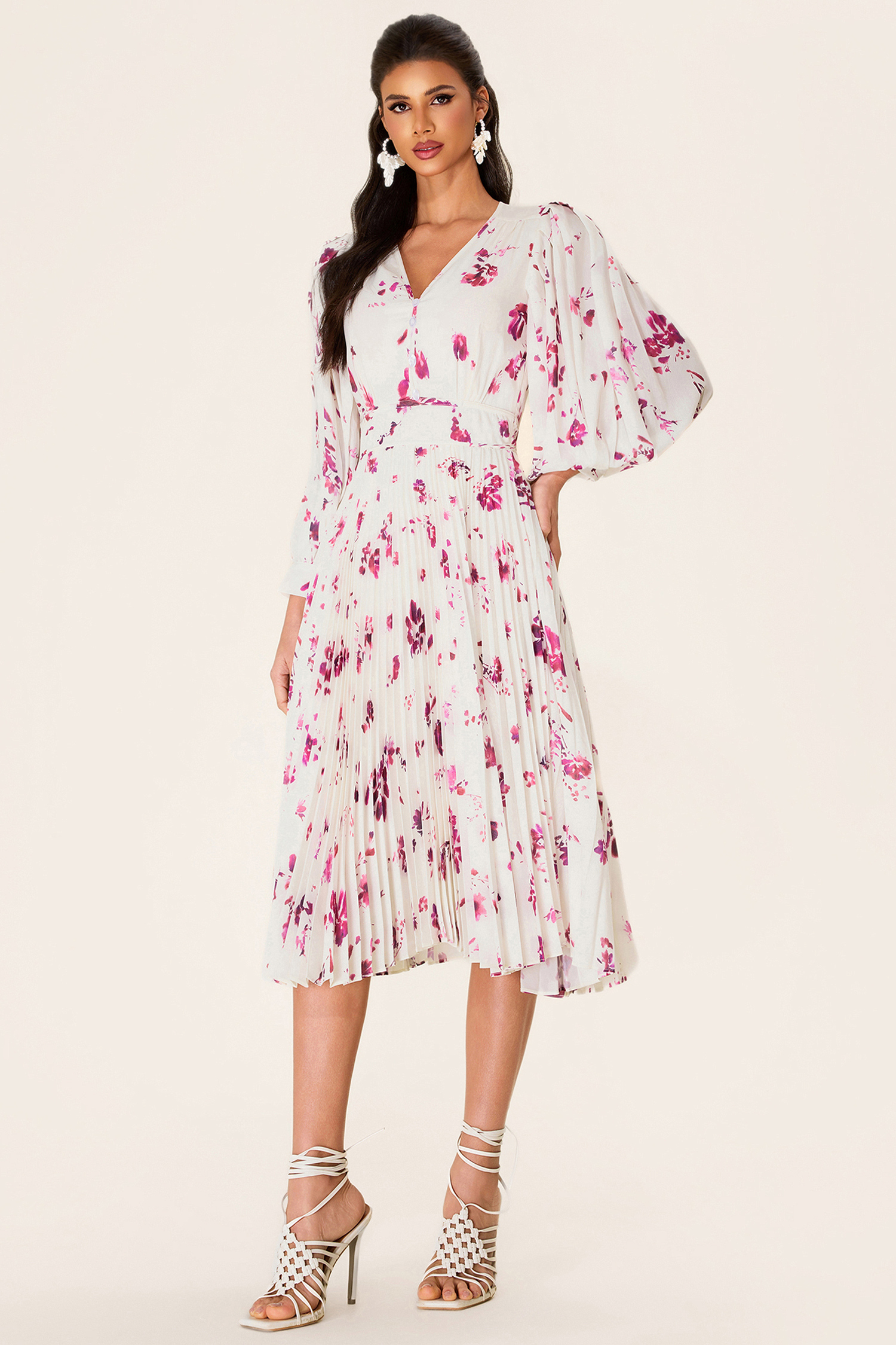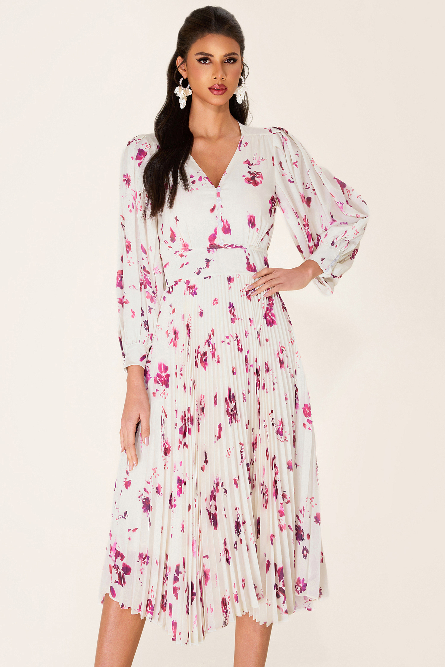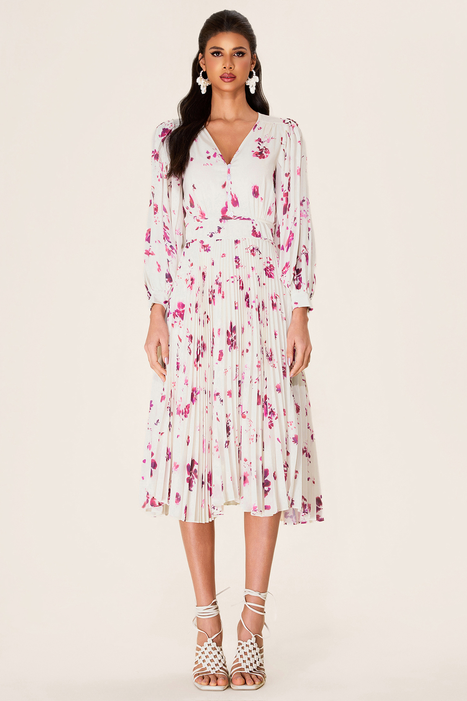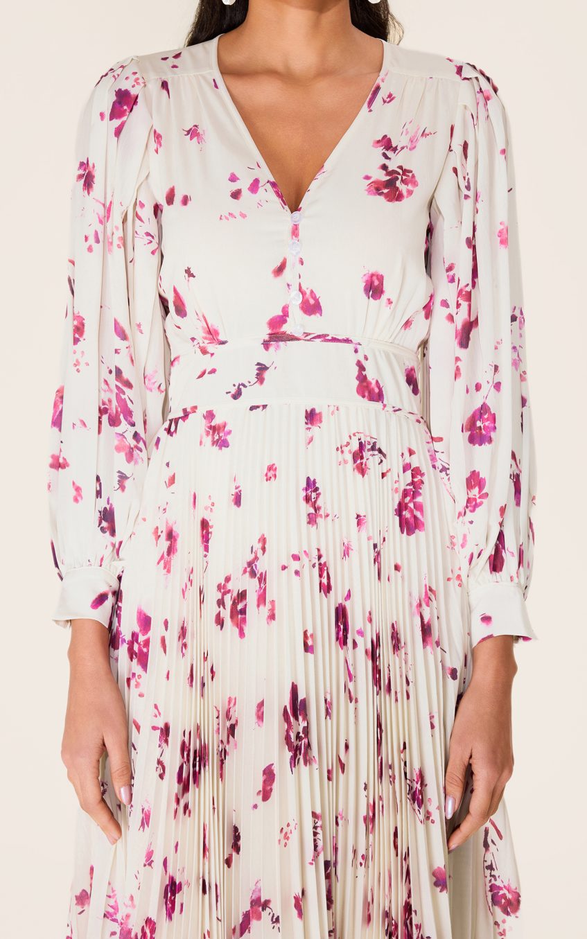 - Long sleeve. white. floral printed. midi dress