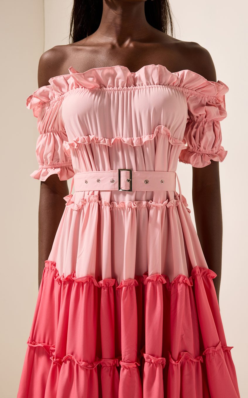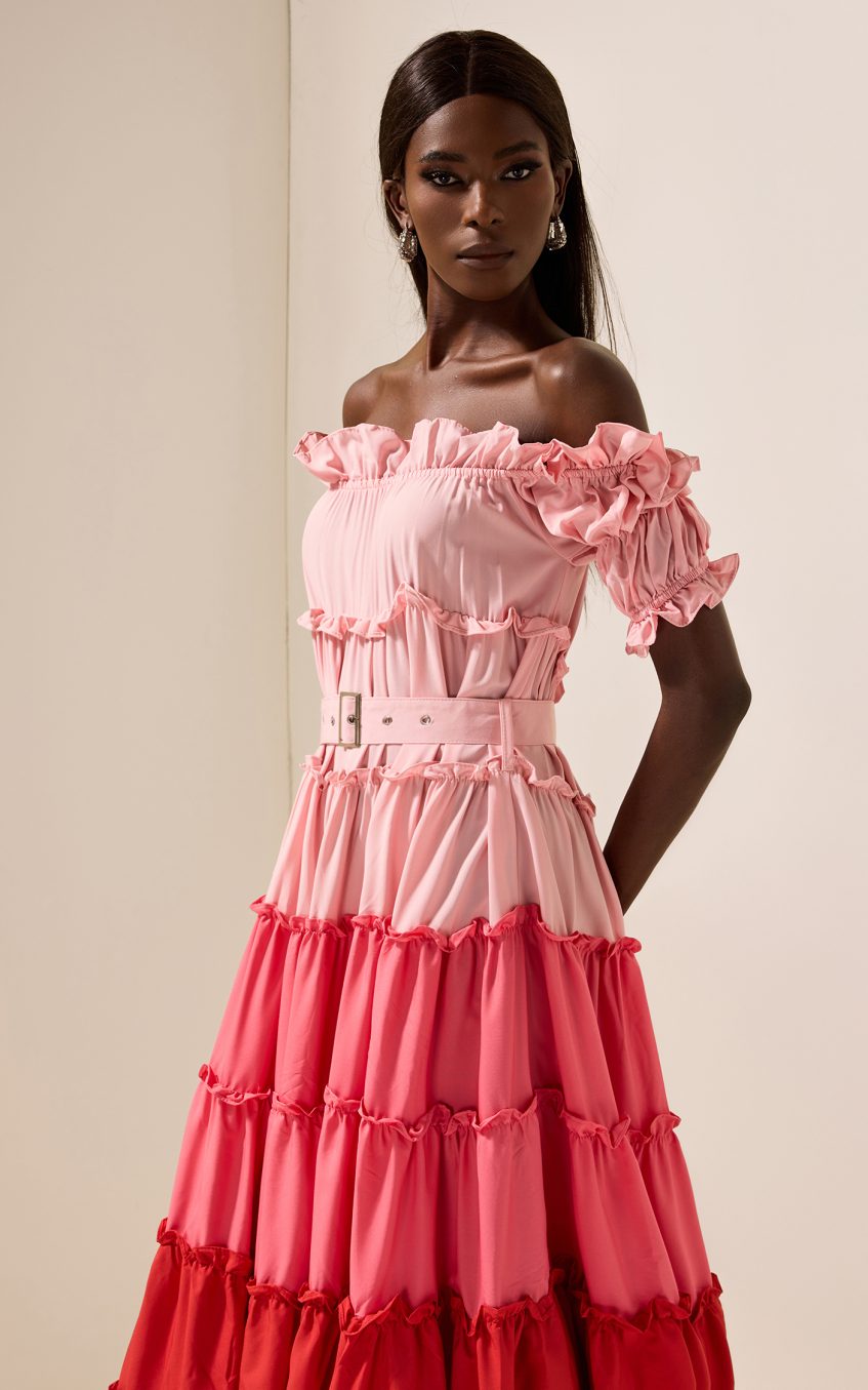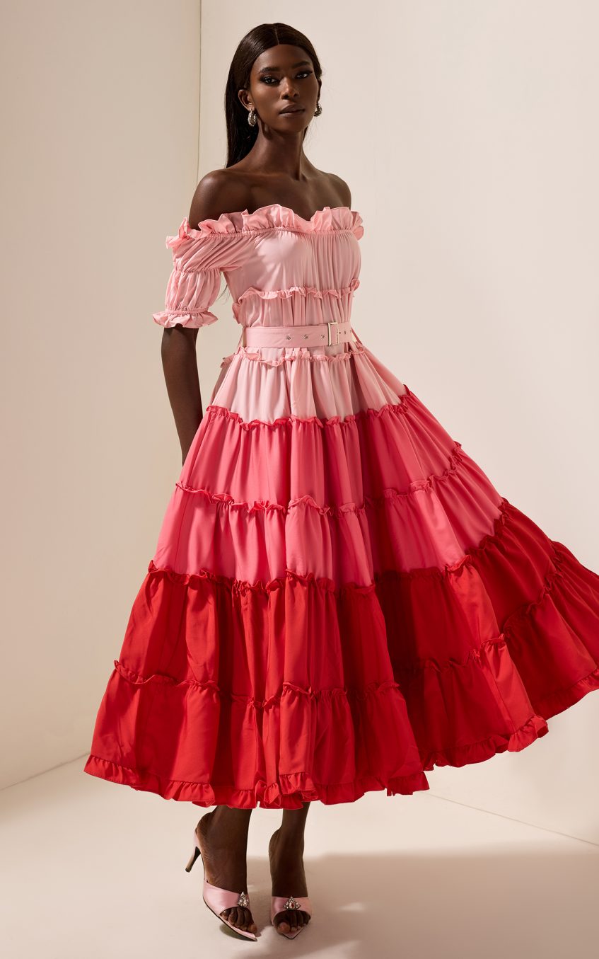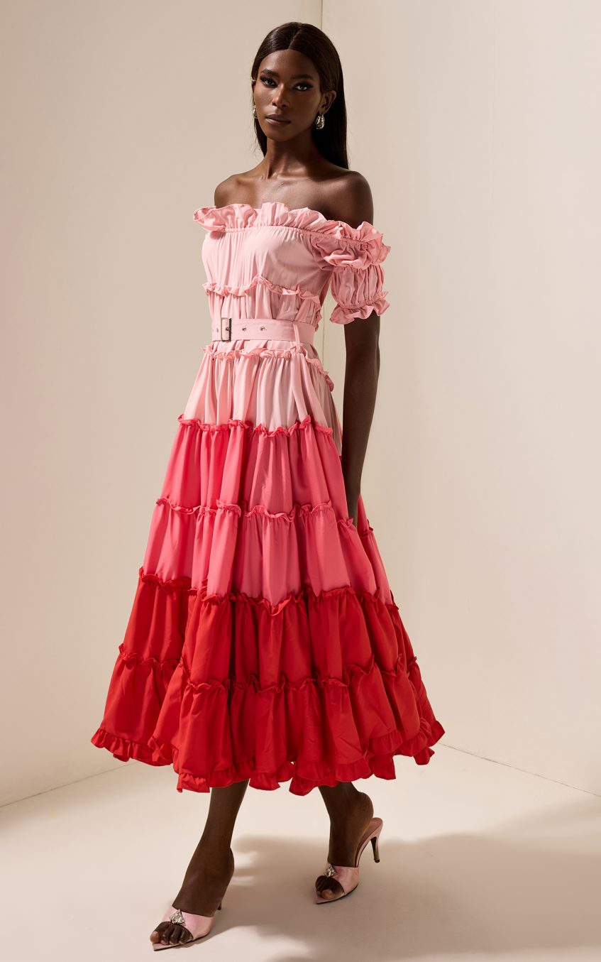 - Off-shoulder. solid color. pink. red. short sleeve. midi dress