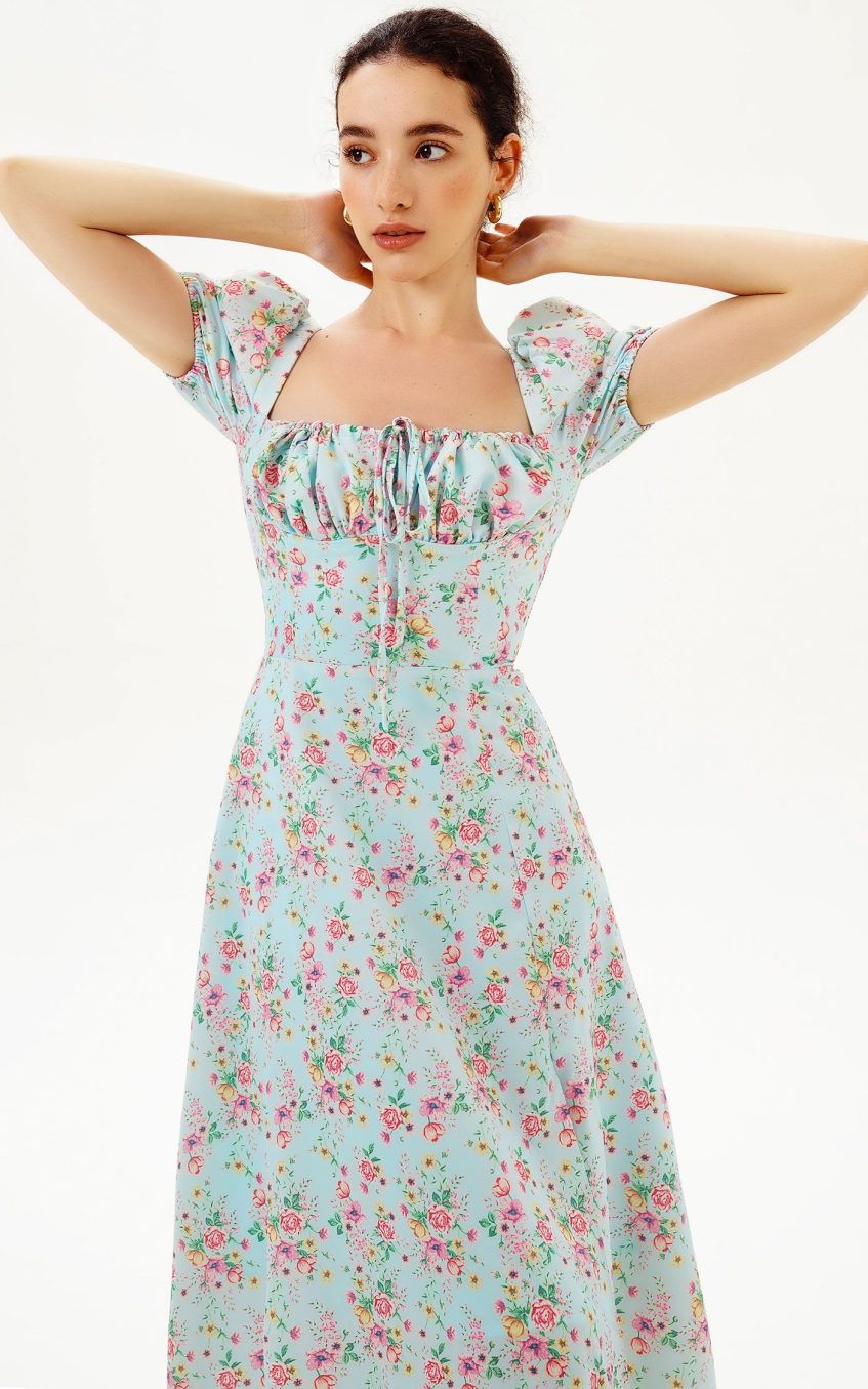 - Square collar. corseted. puff sleeve. slit hem midi dress