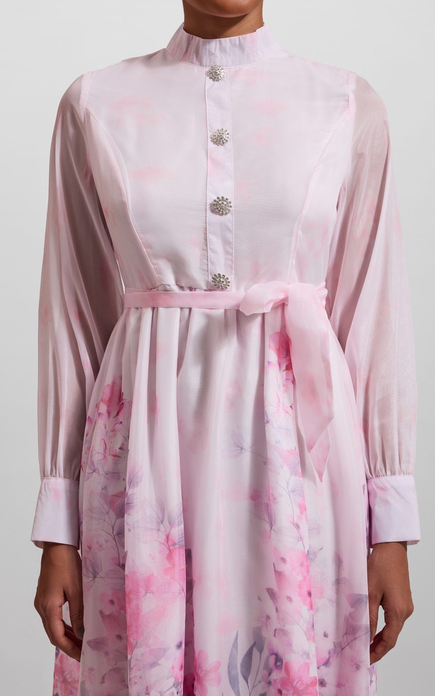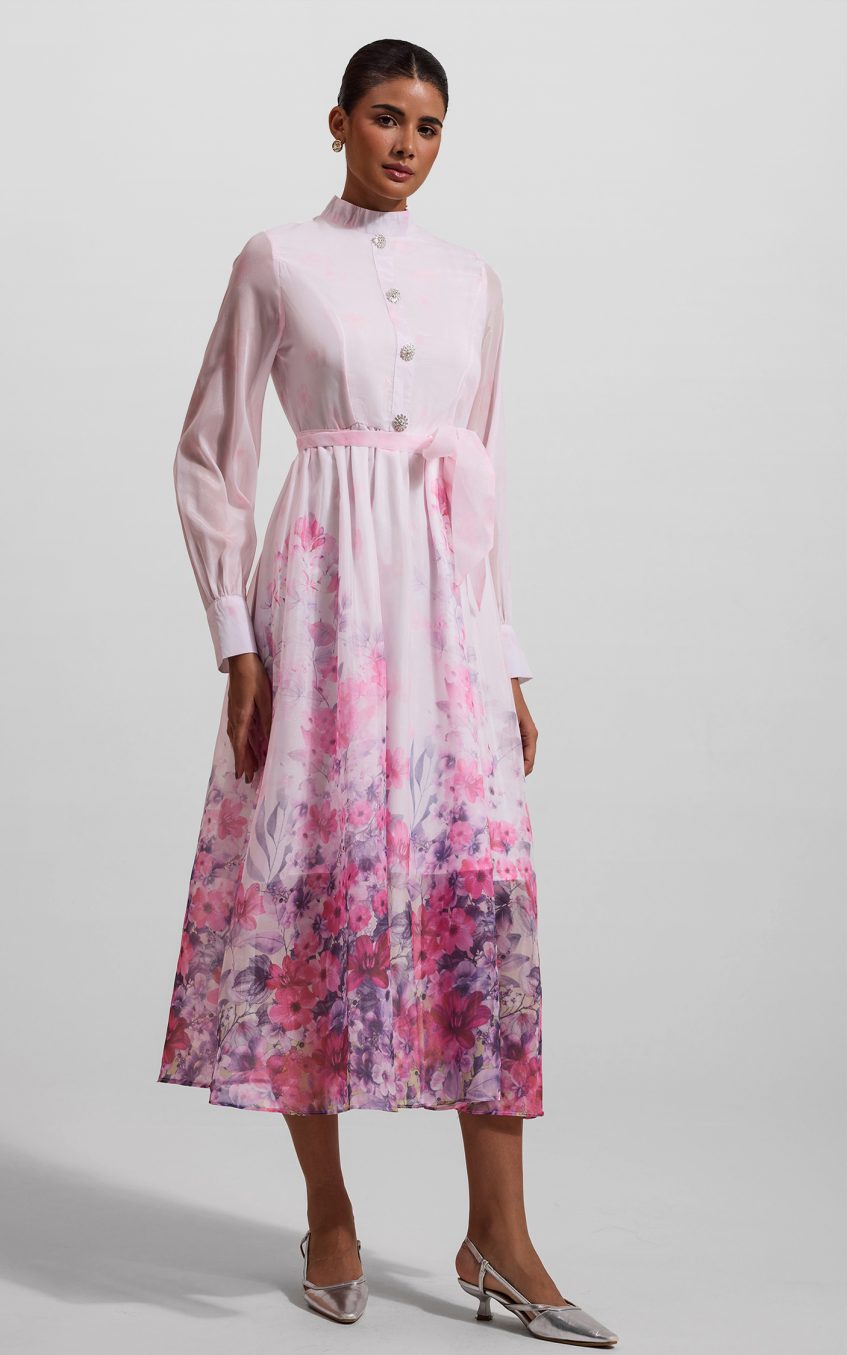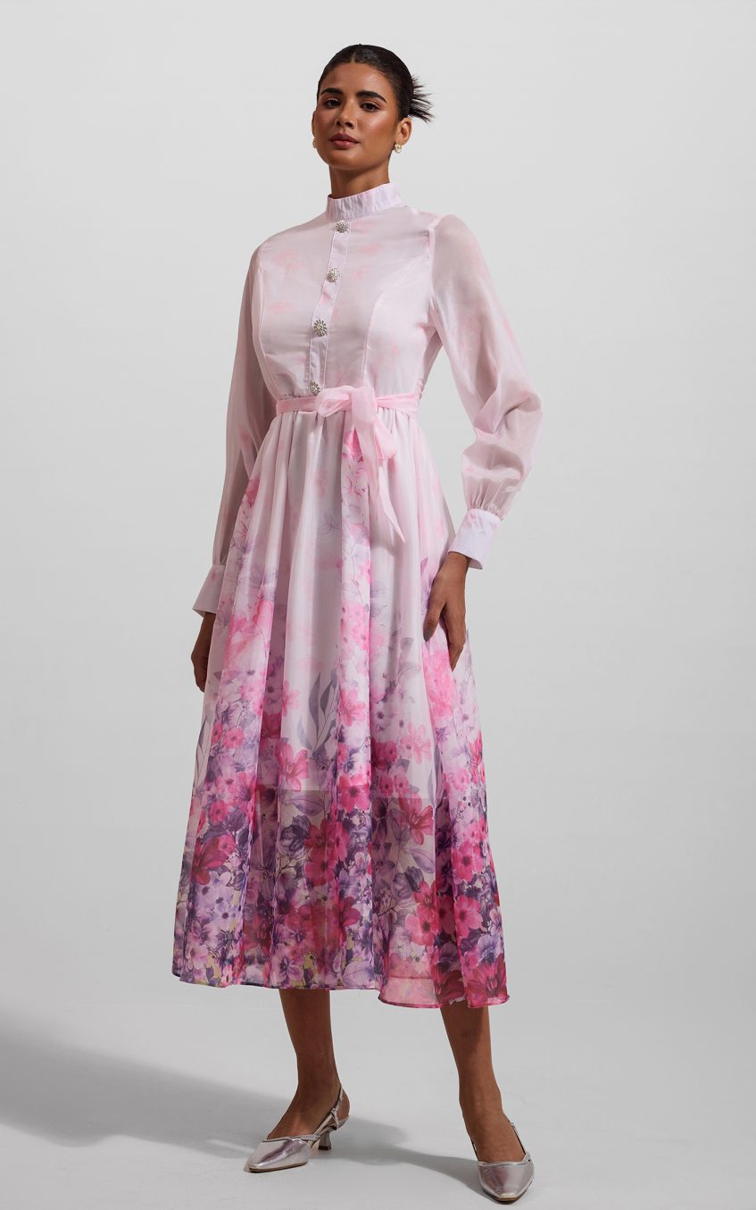 - Floral print. lantern sleeve. midi dress. belted. pink. long sleeve