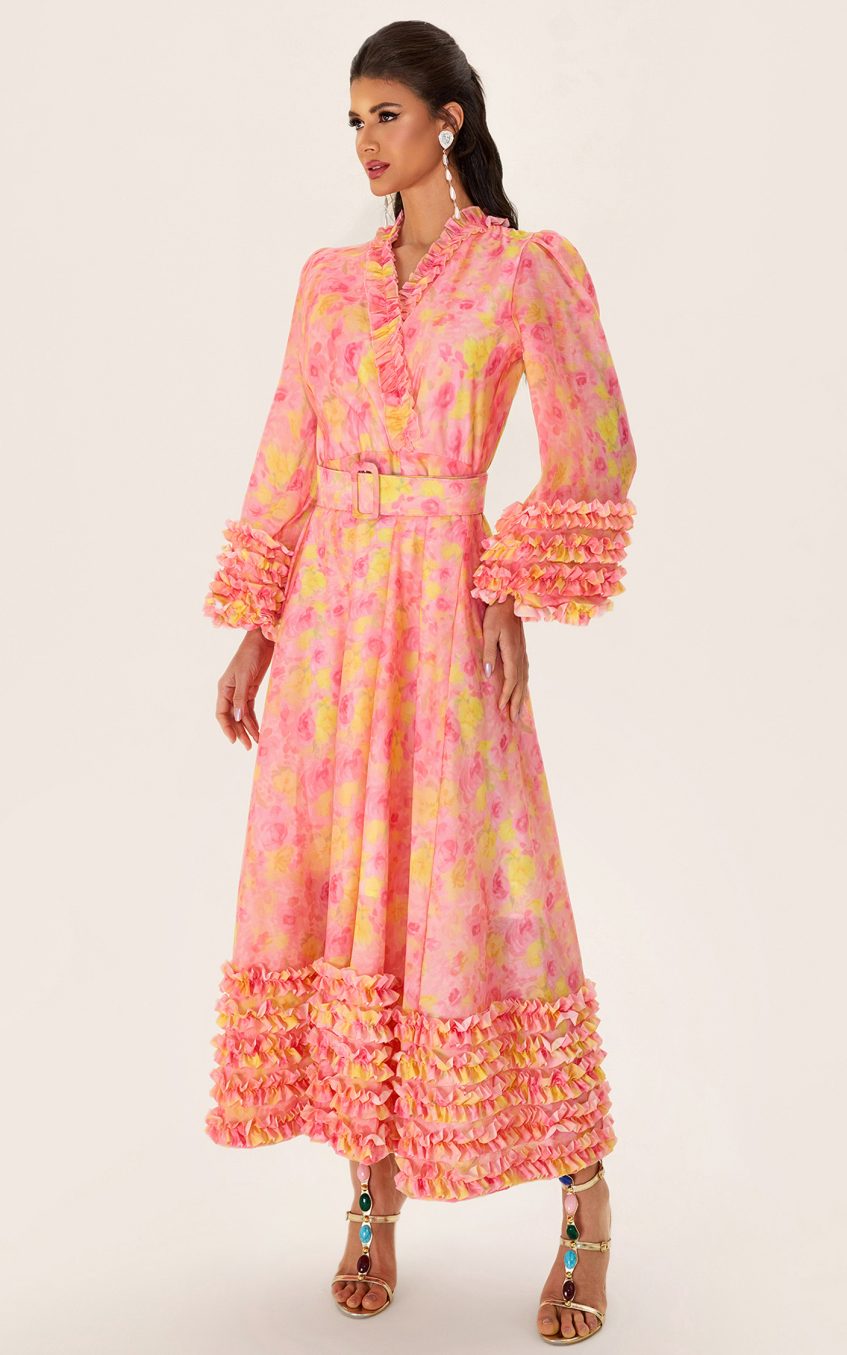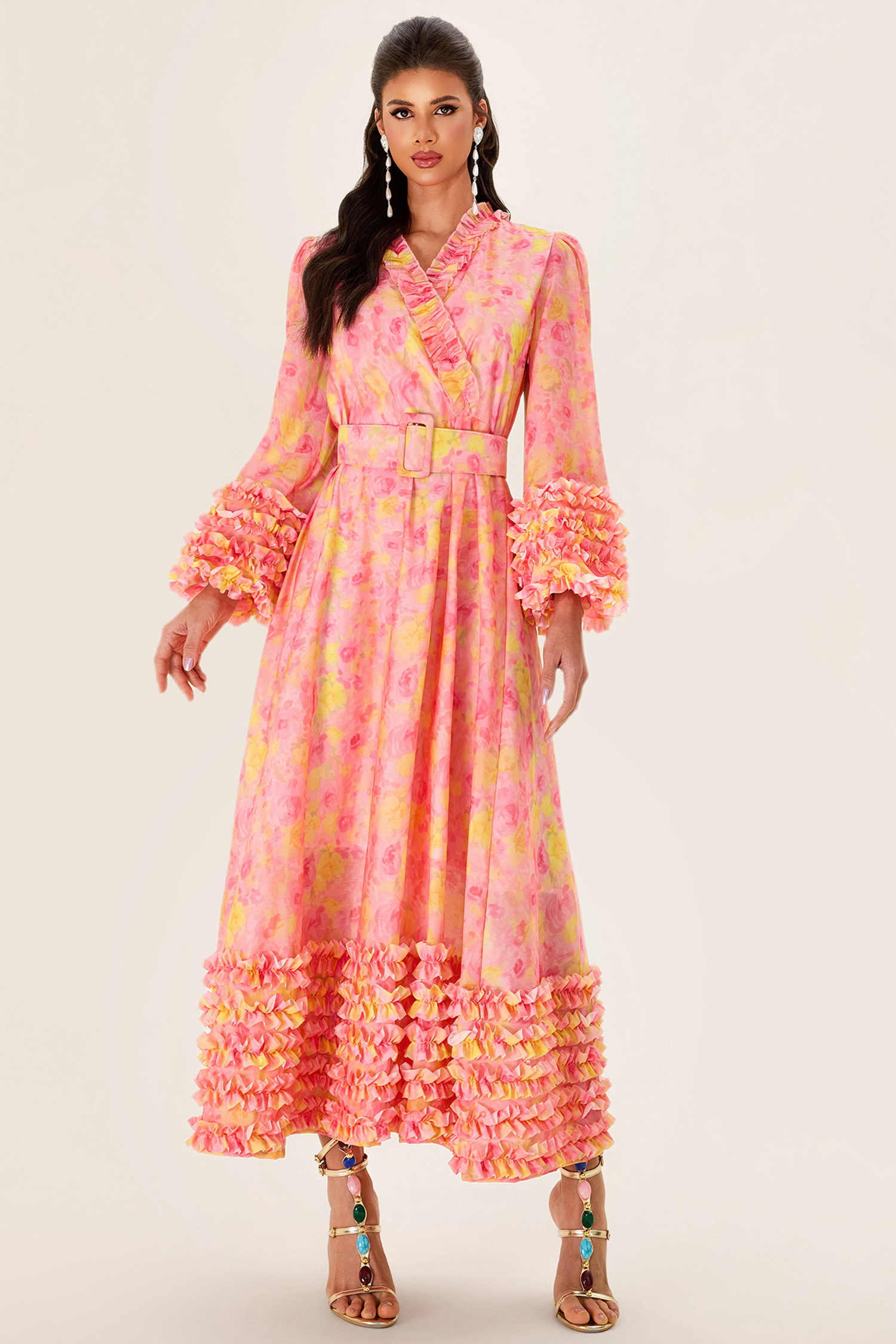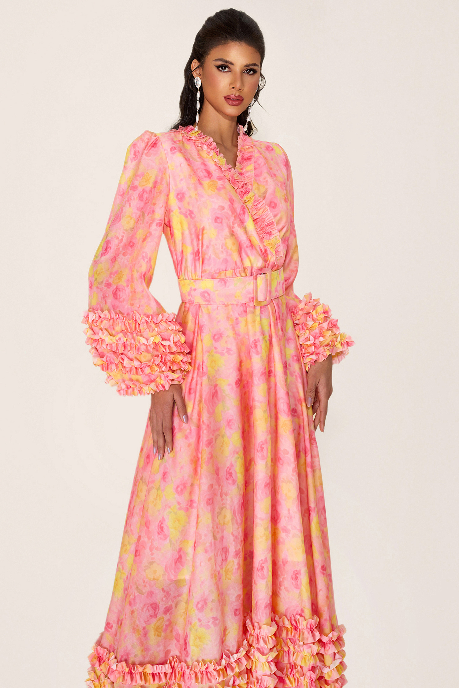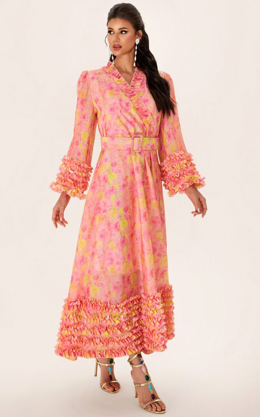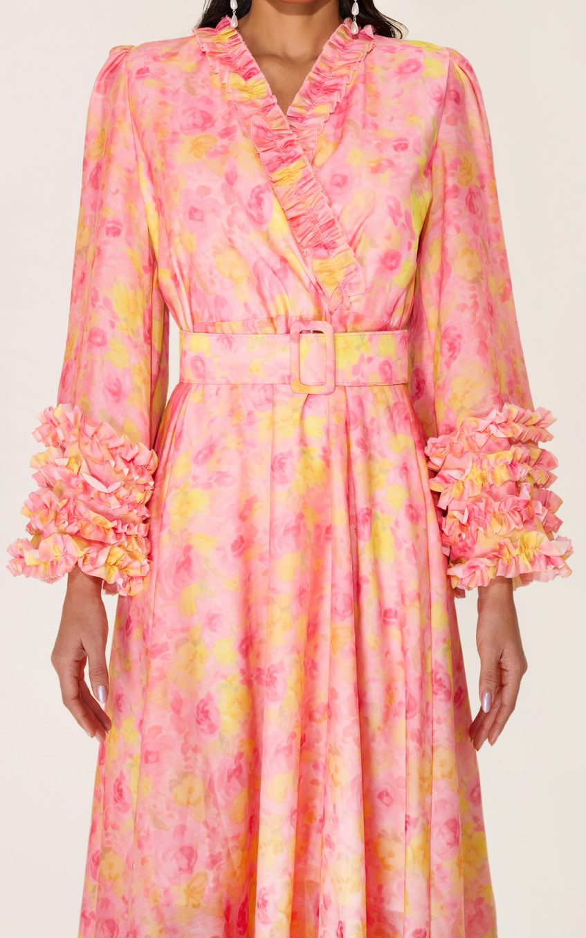 - Long sleeve. floral print. orange. v-neck. midi dress. with belt