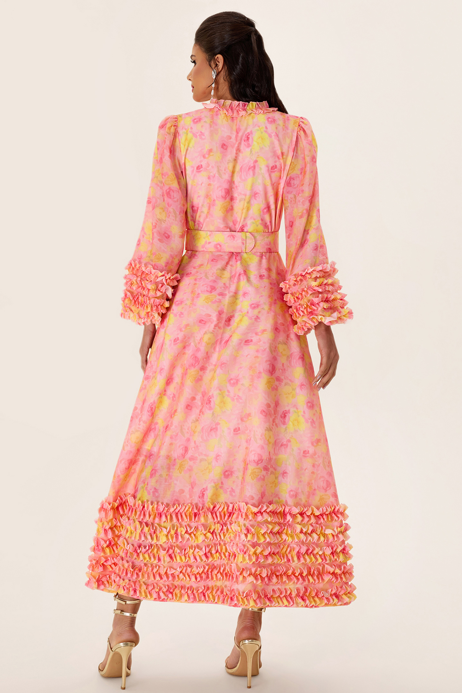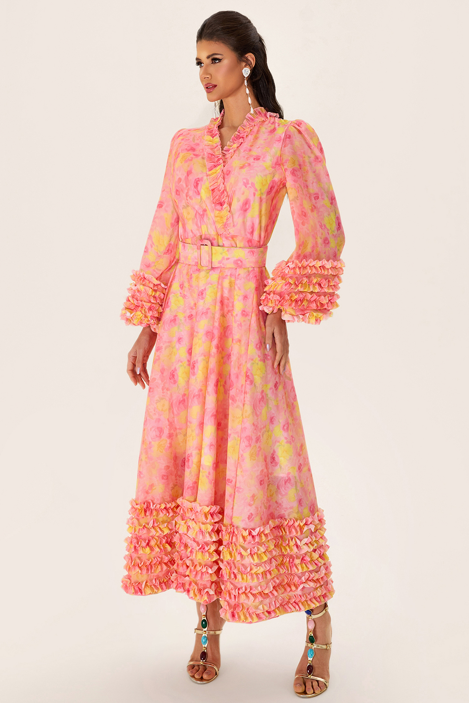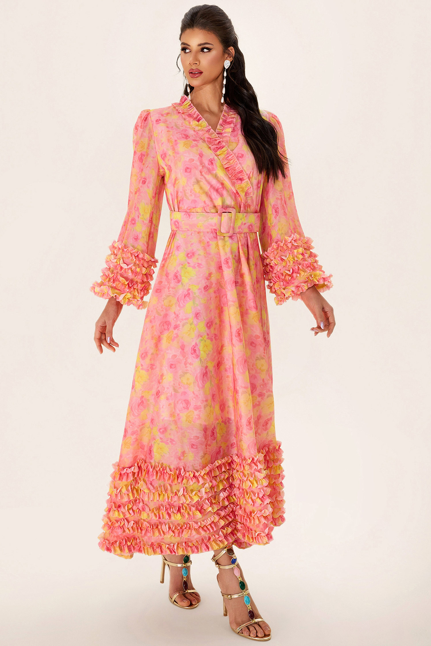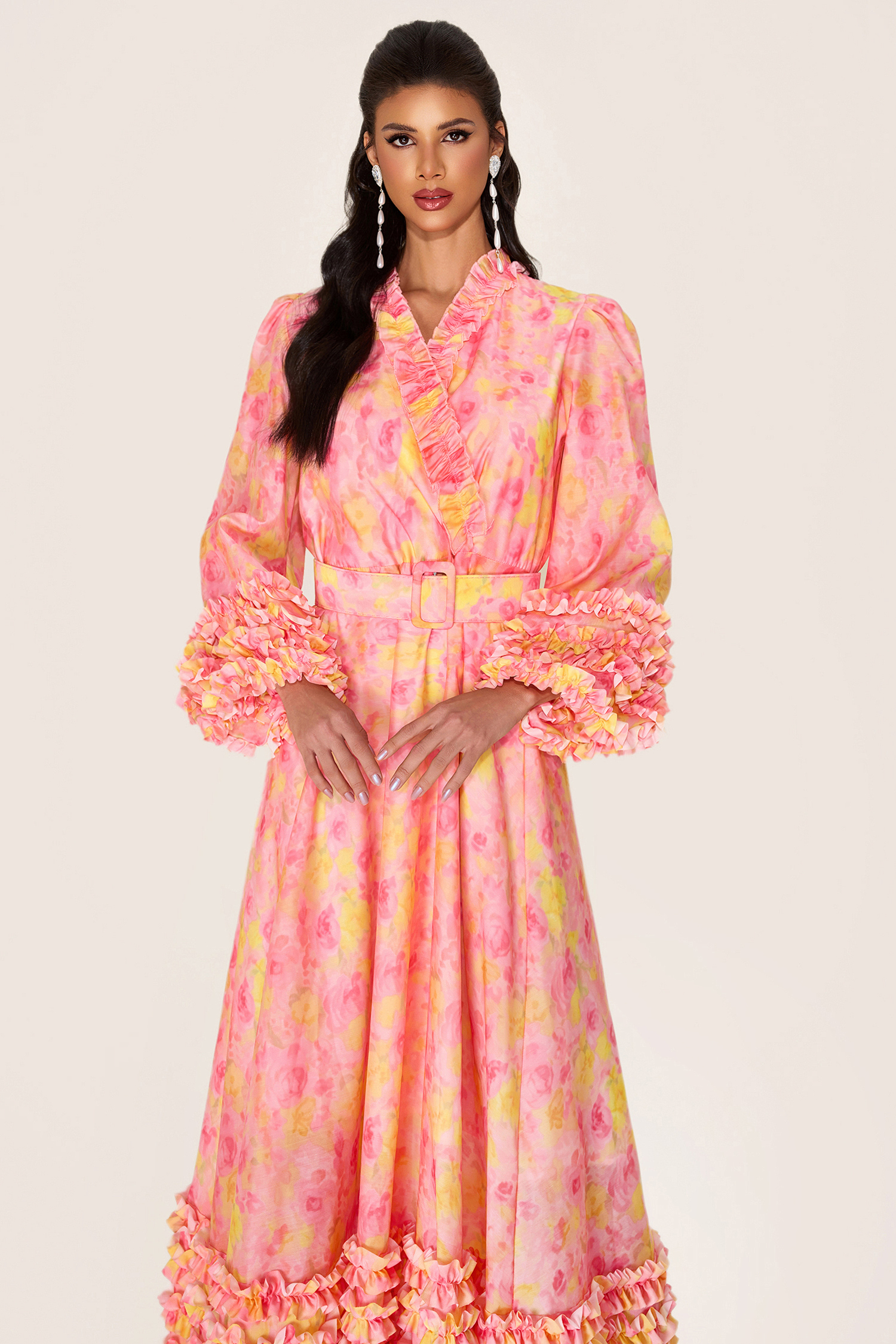 - Long sleeve. floral print. orange. v-neck. midi dress. with belt