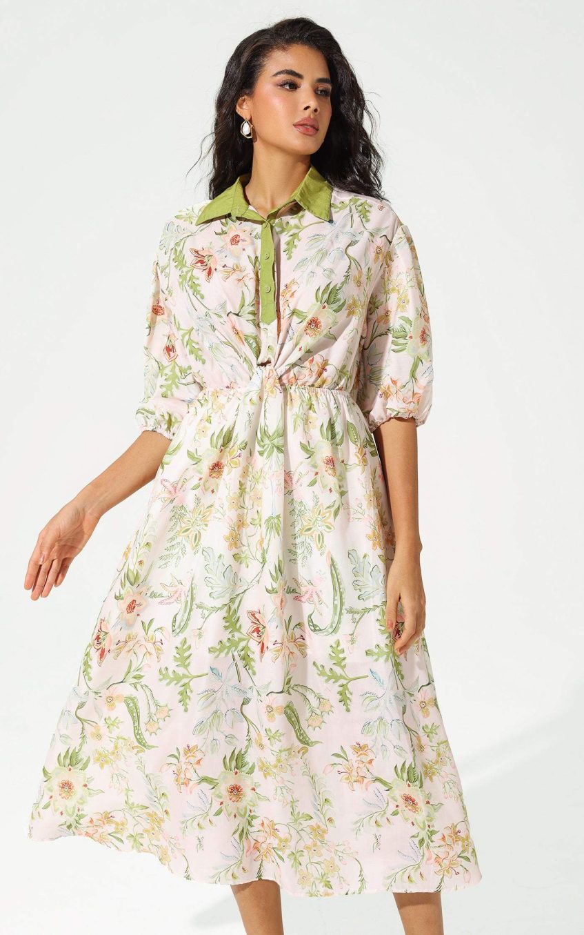 - Floral. long sleeve. lapel. lace up. green. midi