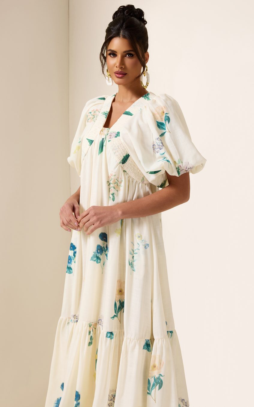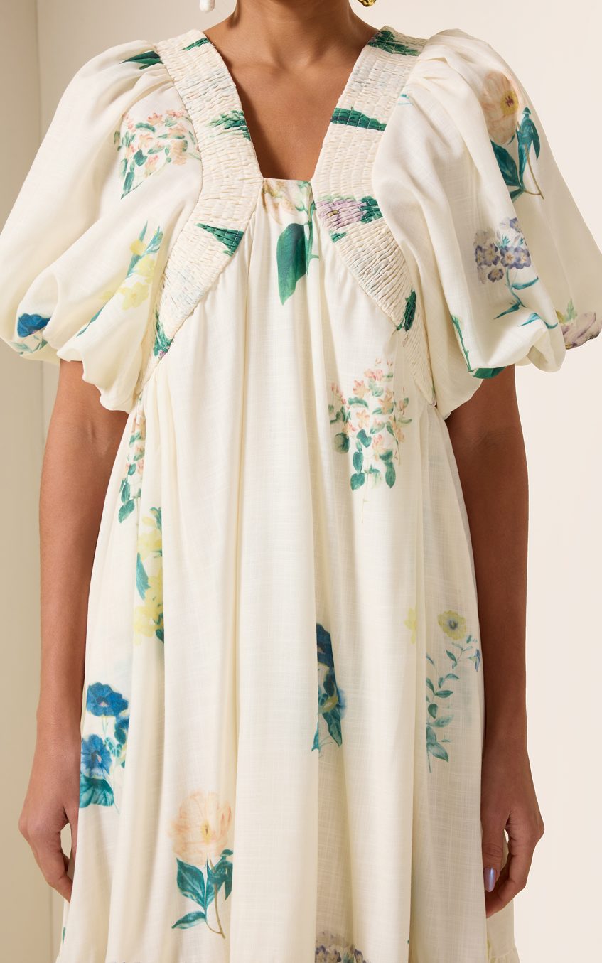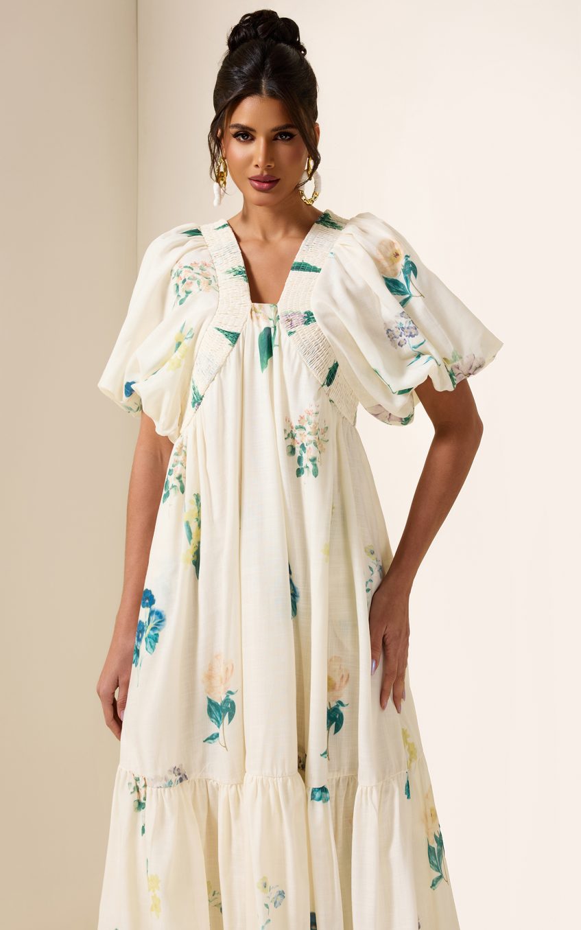 - Short sleeve. apricot. floral print. puff-sleeve. smocking. midi dress