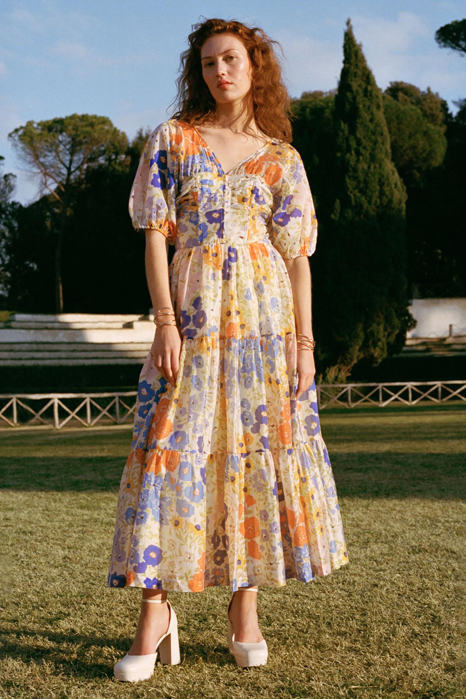 Floral Puff Sleeve V-Neck Maxi Dress