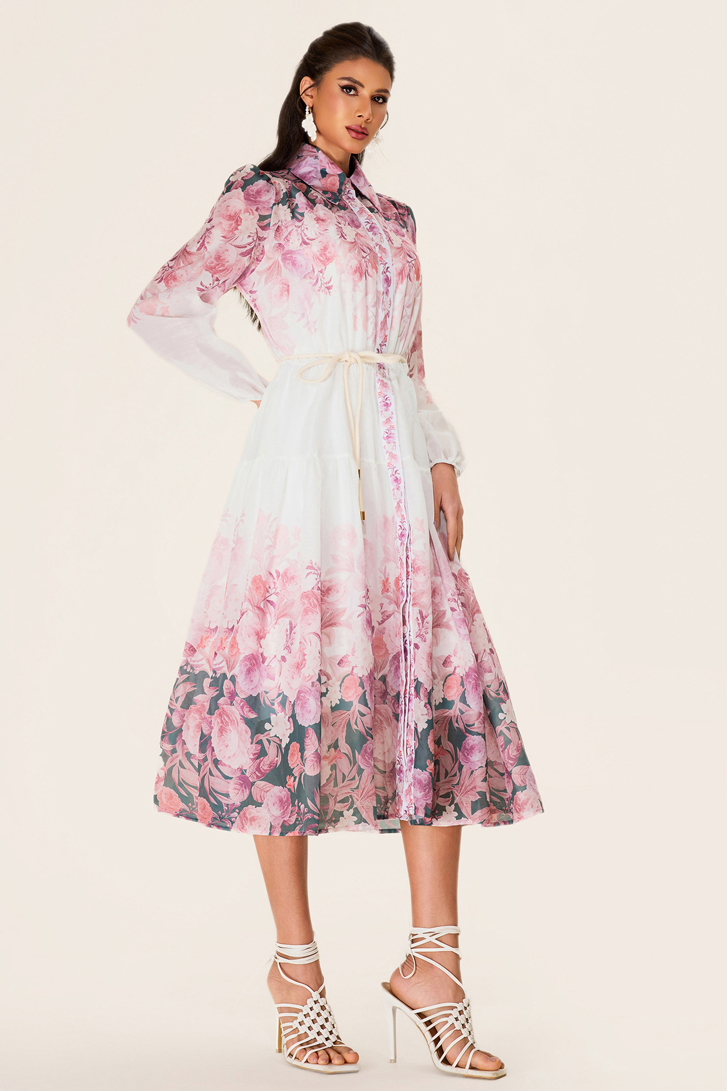 - Long sleeve. white. floral printed. shirt collar. midi dress