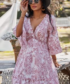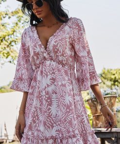 Floral V-Neck Mid Sleeve Backless Lace Up Ruffle Hem Mini Dress