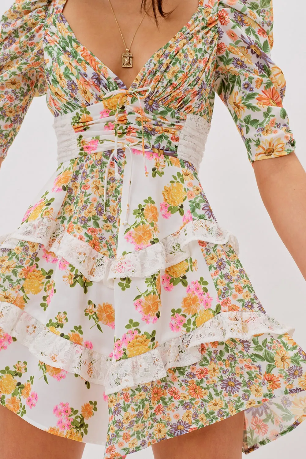 Floral V-Neck Mid Sleeve Backless Lace Up Ruffle Hem Mini Dress