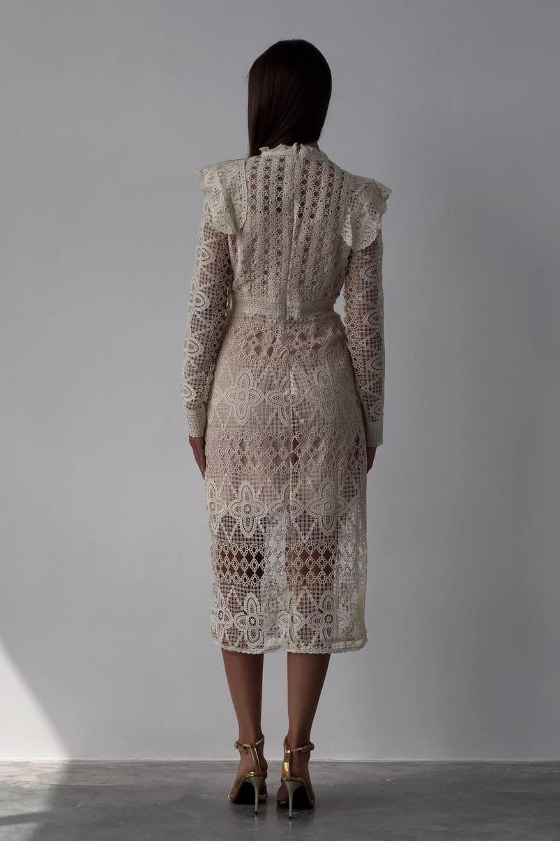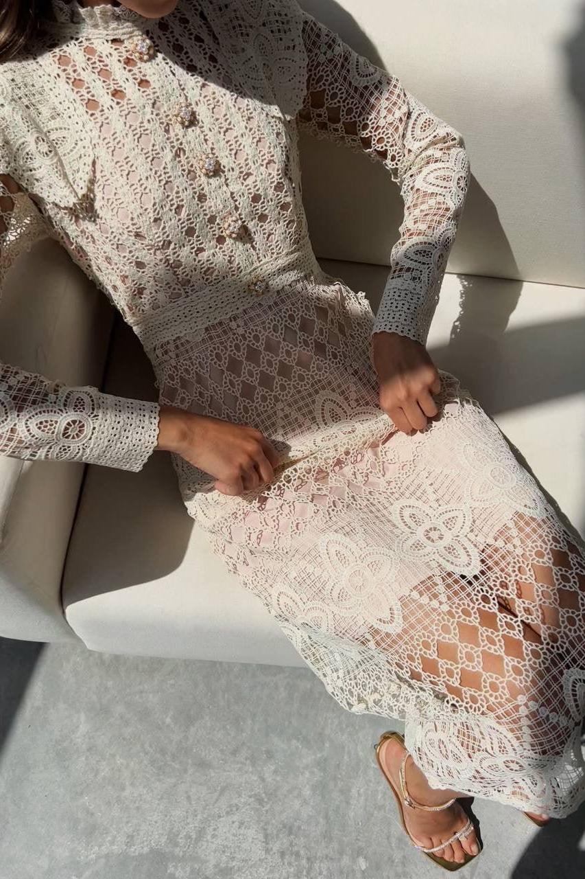 Tags: 202504, 20250410, Button, date, Dress, Faux Pearl, Lace, long sleeve, midi dress, polyester, Solid Color, spring, White
