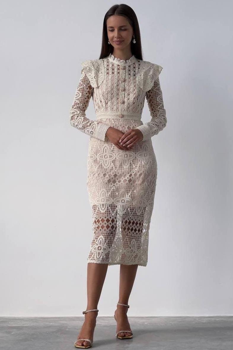 Lace Faux Pearl Button Long Sleeve Midi Dress