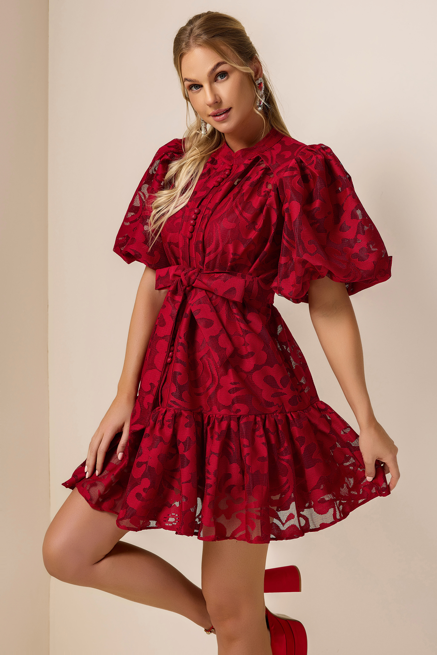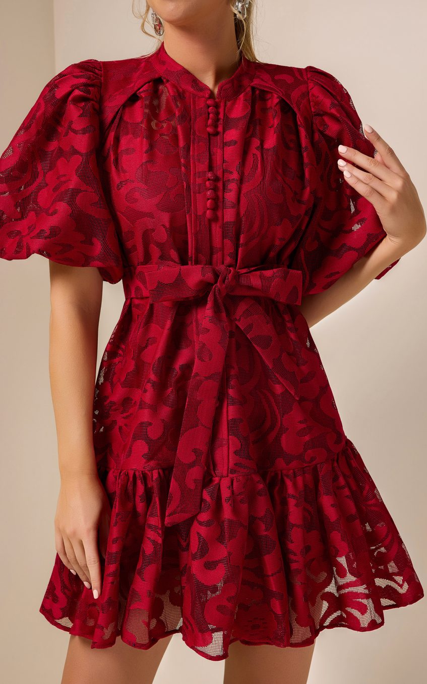 - Mid sleeve. solid color. red. single breasted. ruffle. mini dress