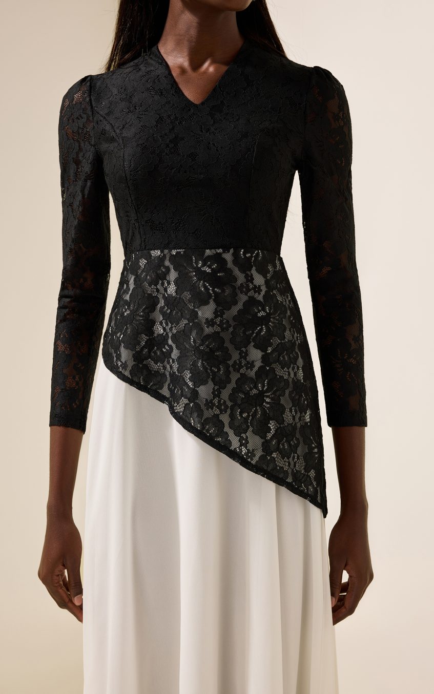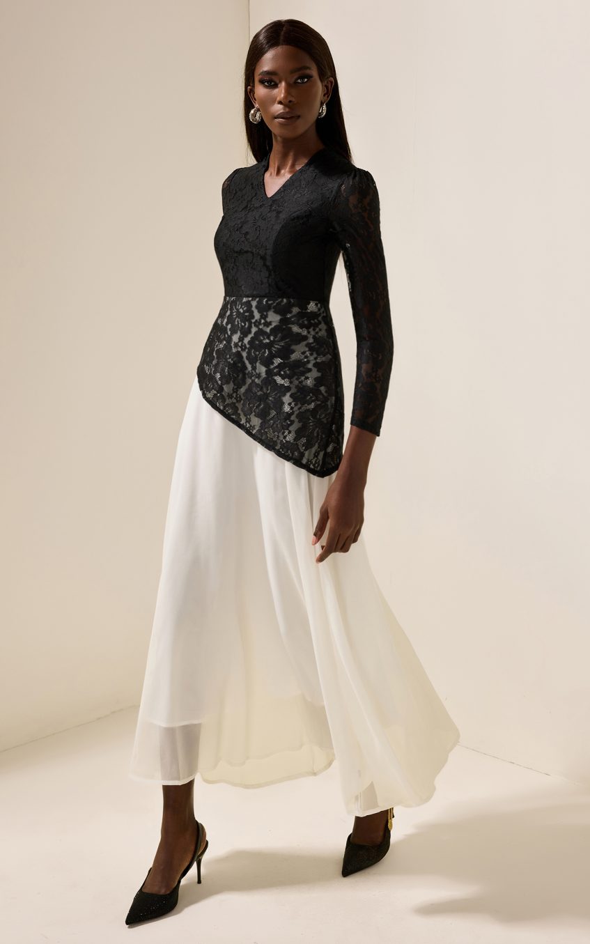 - Long sleeve. black. white. chiffon. lace. splicing. v-neck. midi dress