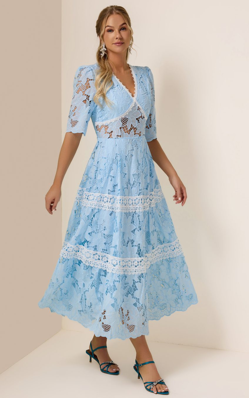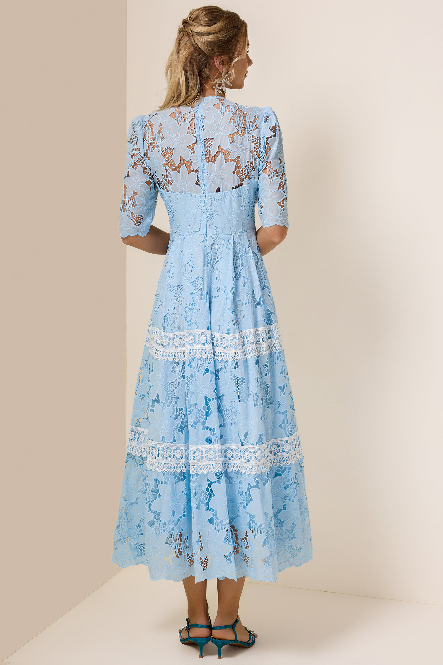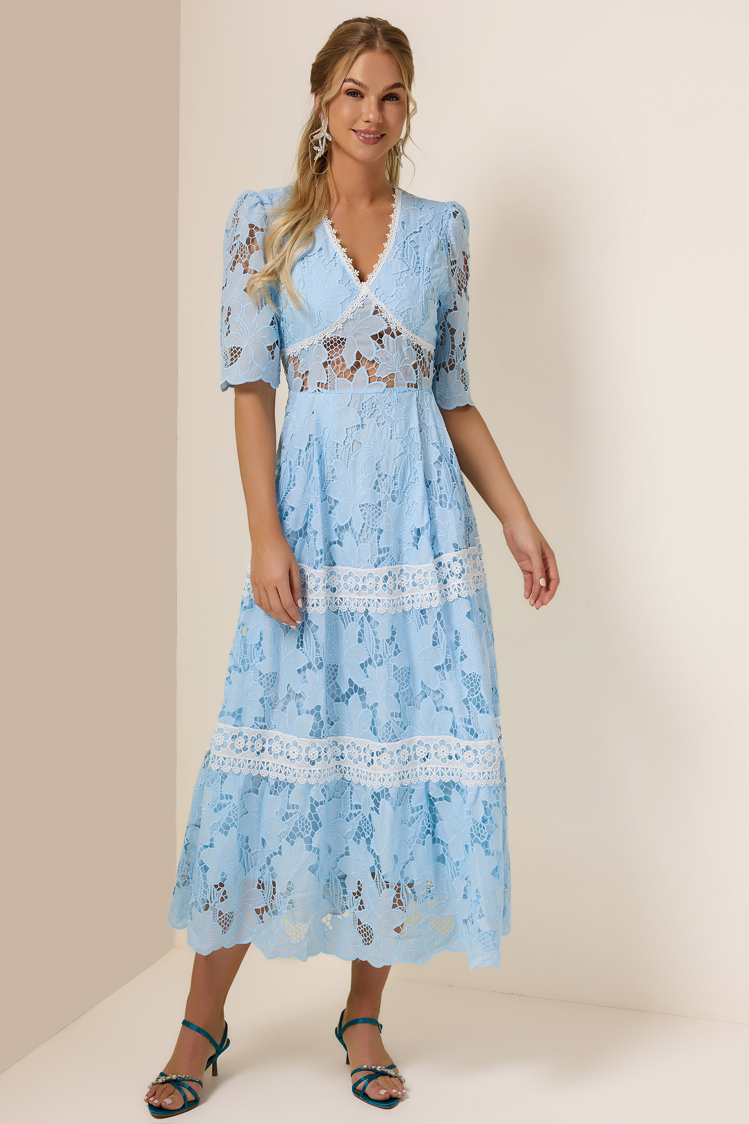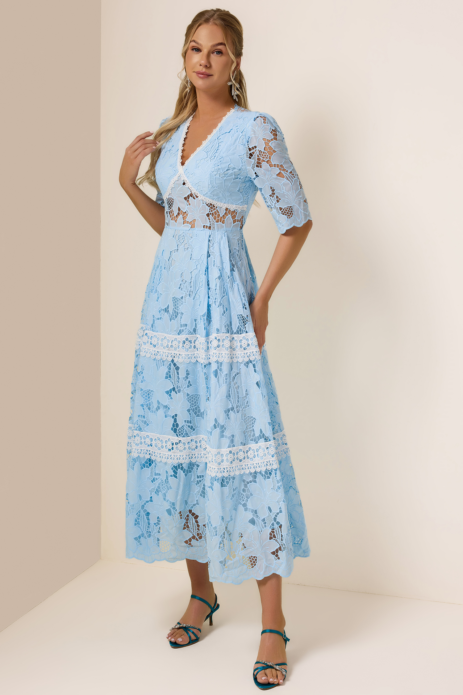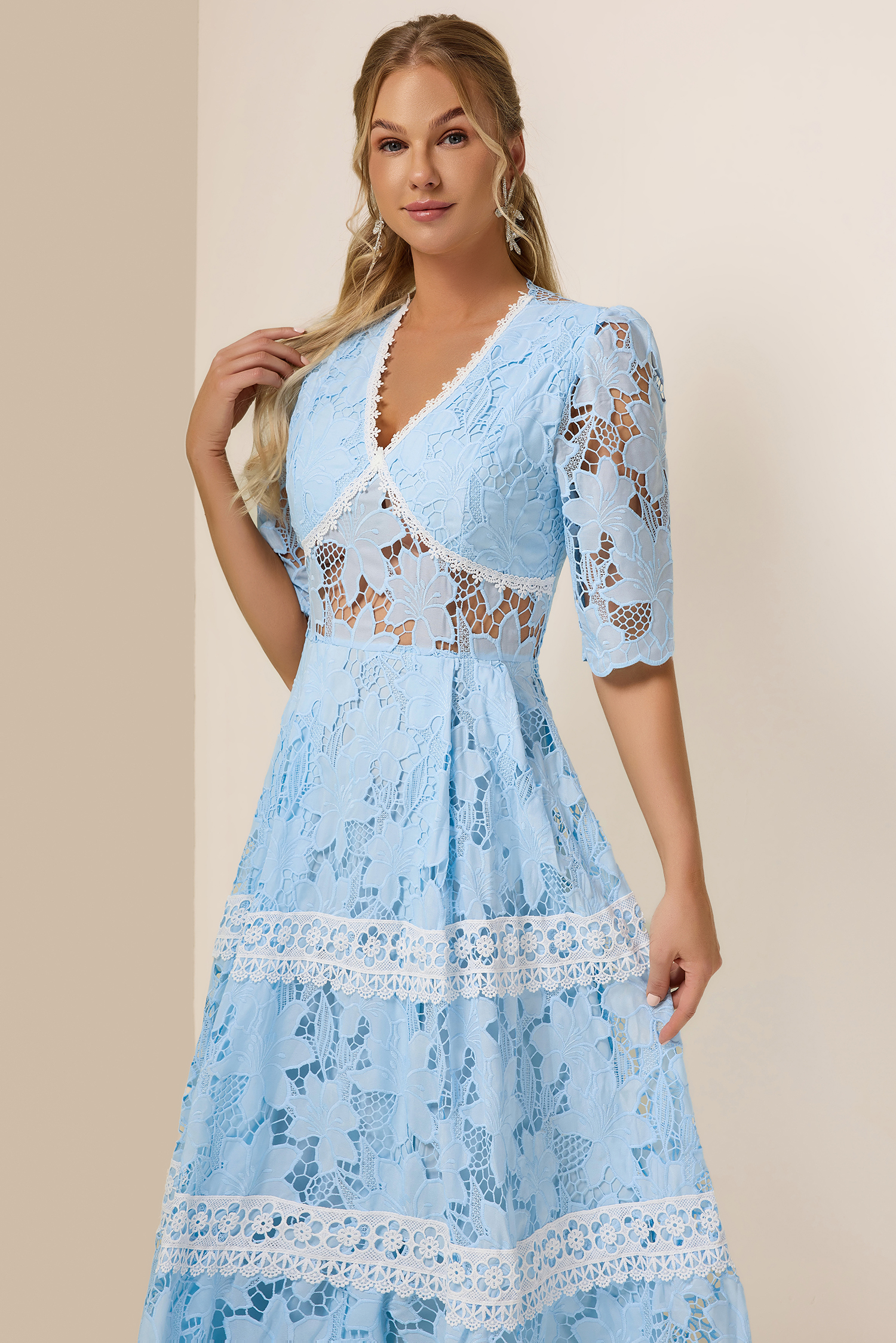 - Short sleeves. lace. splicing. V-neck. midi dress