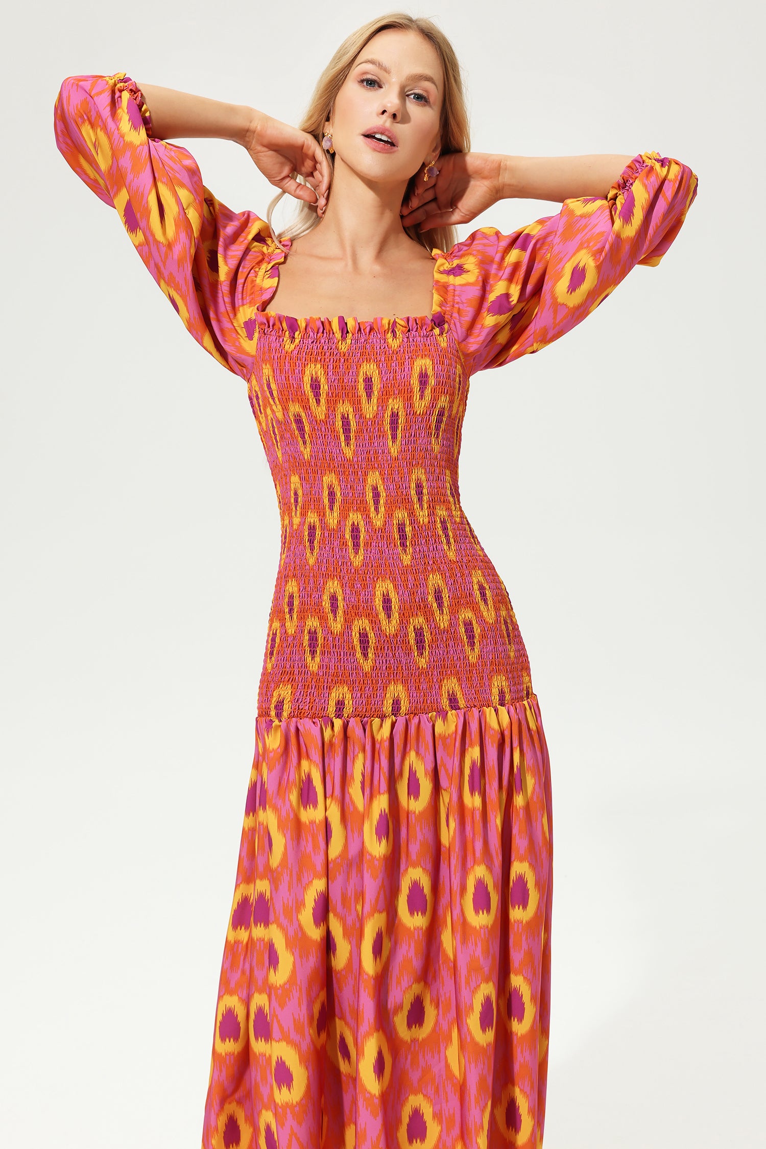 - Off-shoulder. floral printed. lantern sleeve. smocked elastic