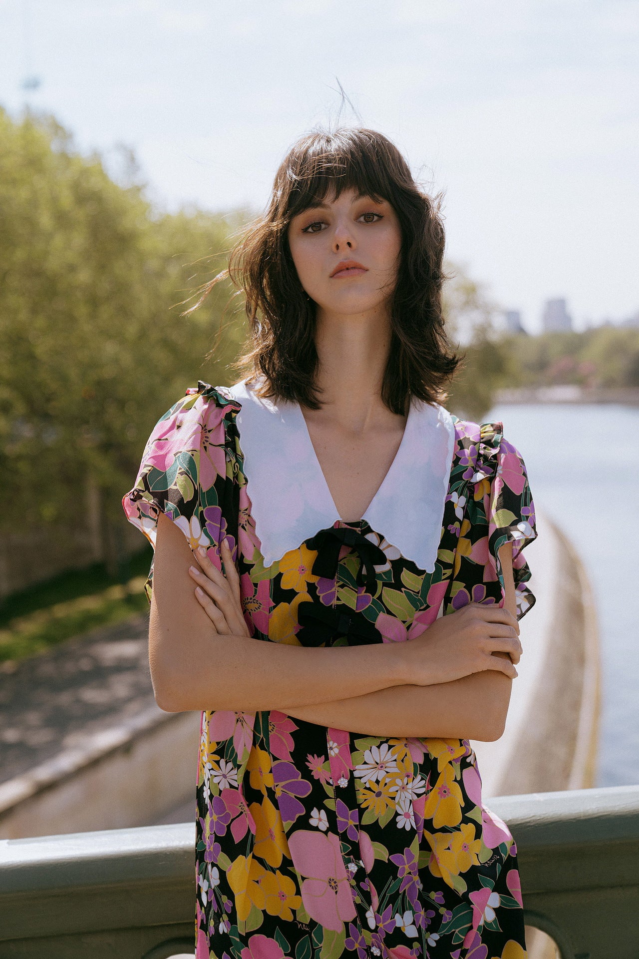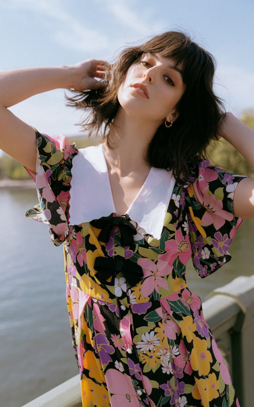 - Floral. short sleeve. v-neck. doll collar