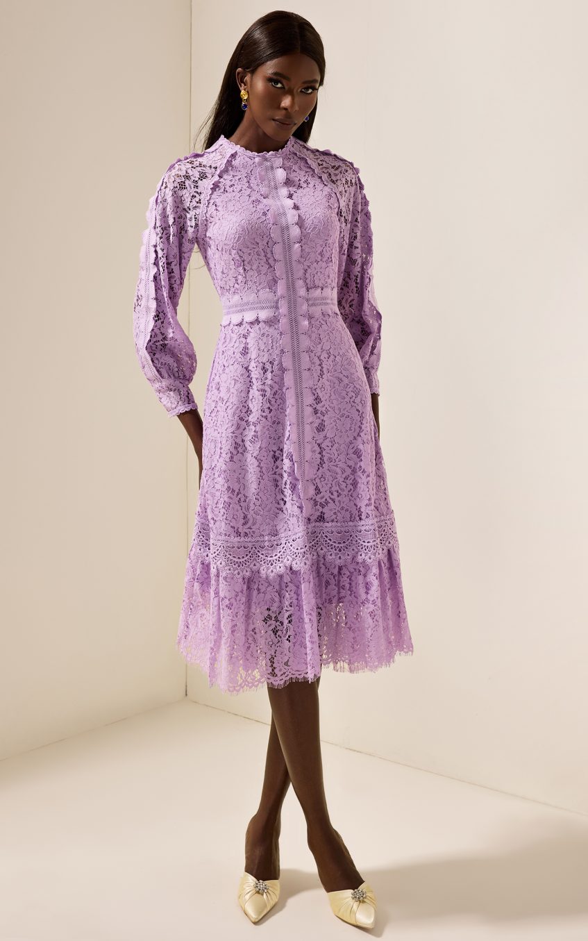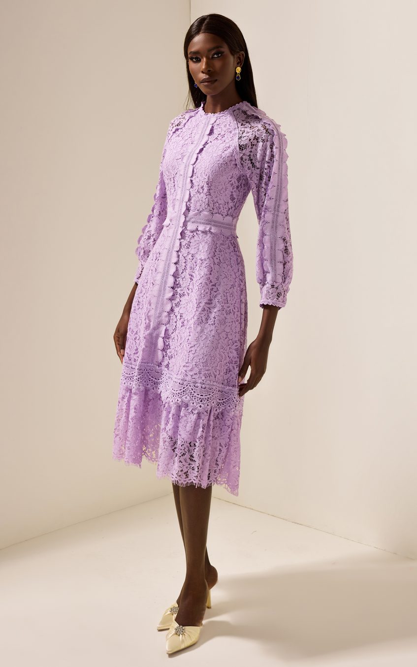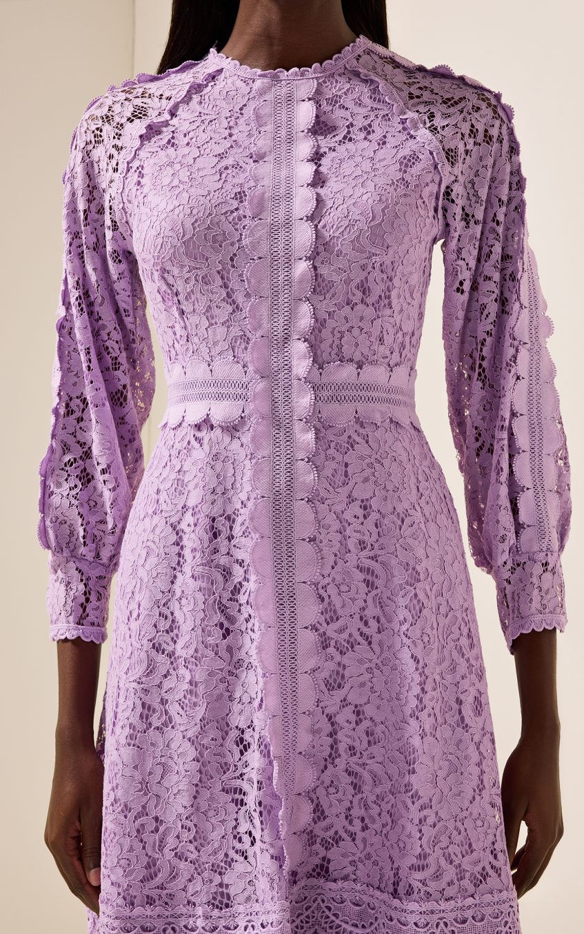 - Long sleeve. embroidered. solid color. lavender. midi dress