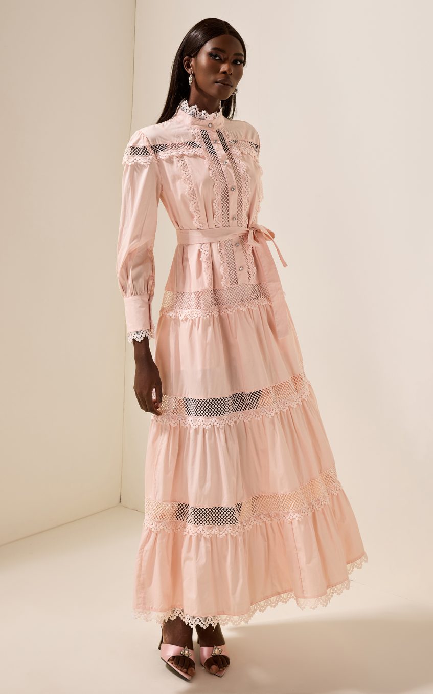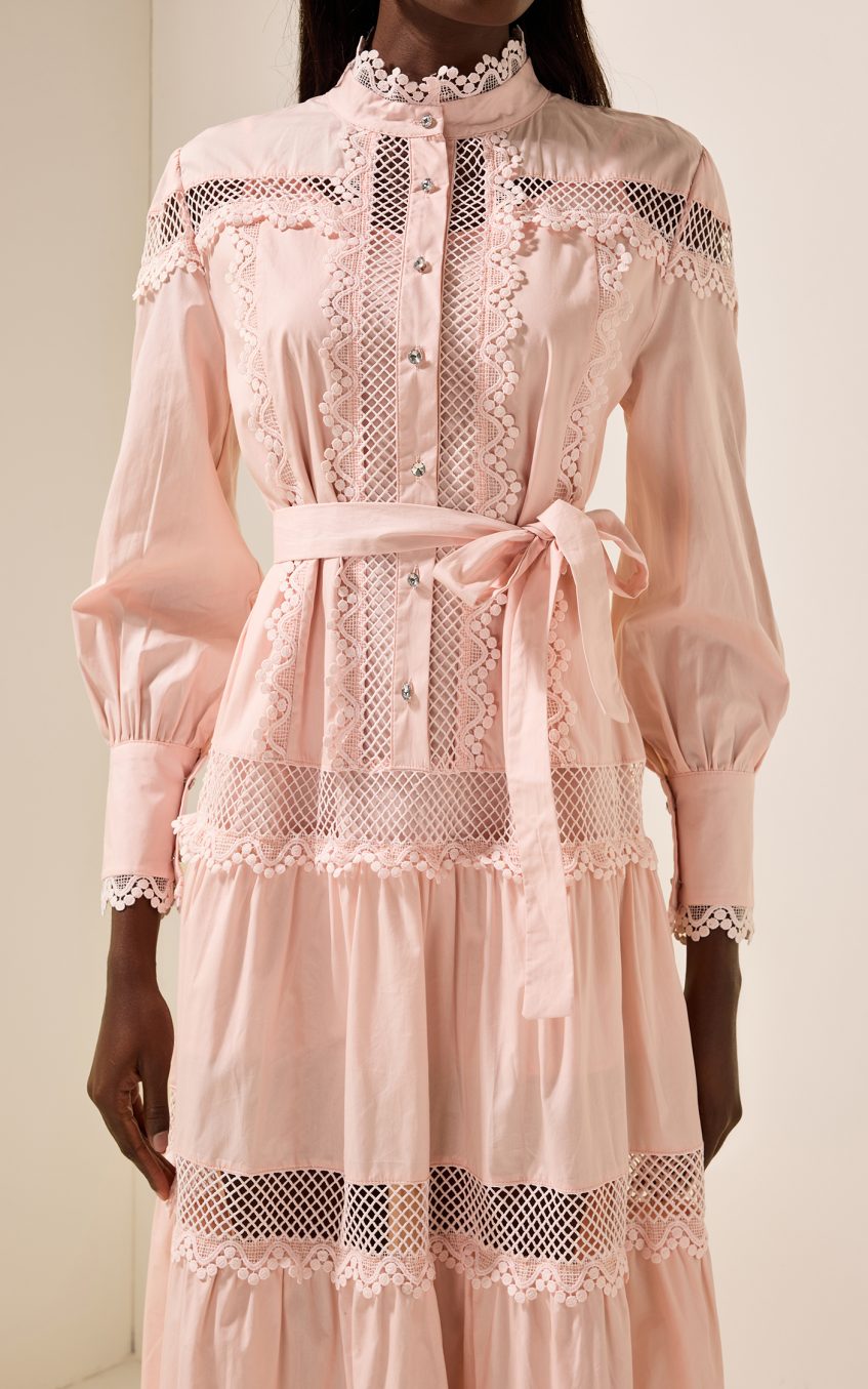 - Long sleeve. solid color. pink. lace bottom. with belt. midi dress