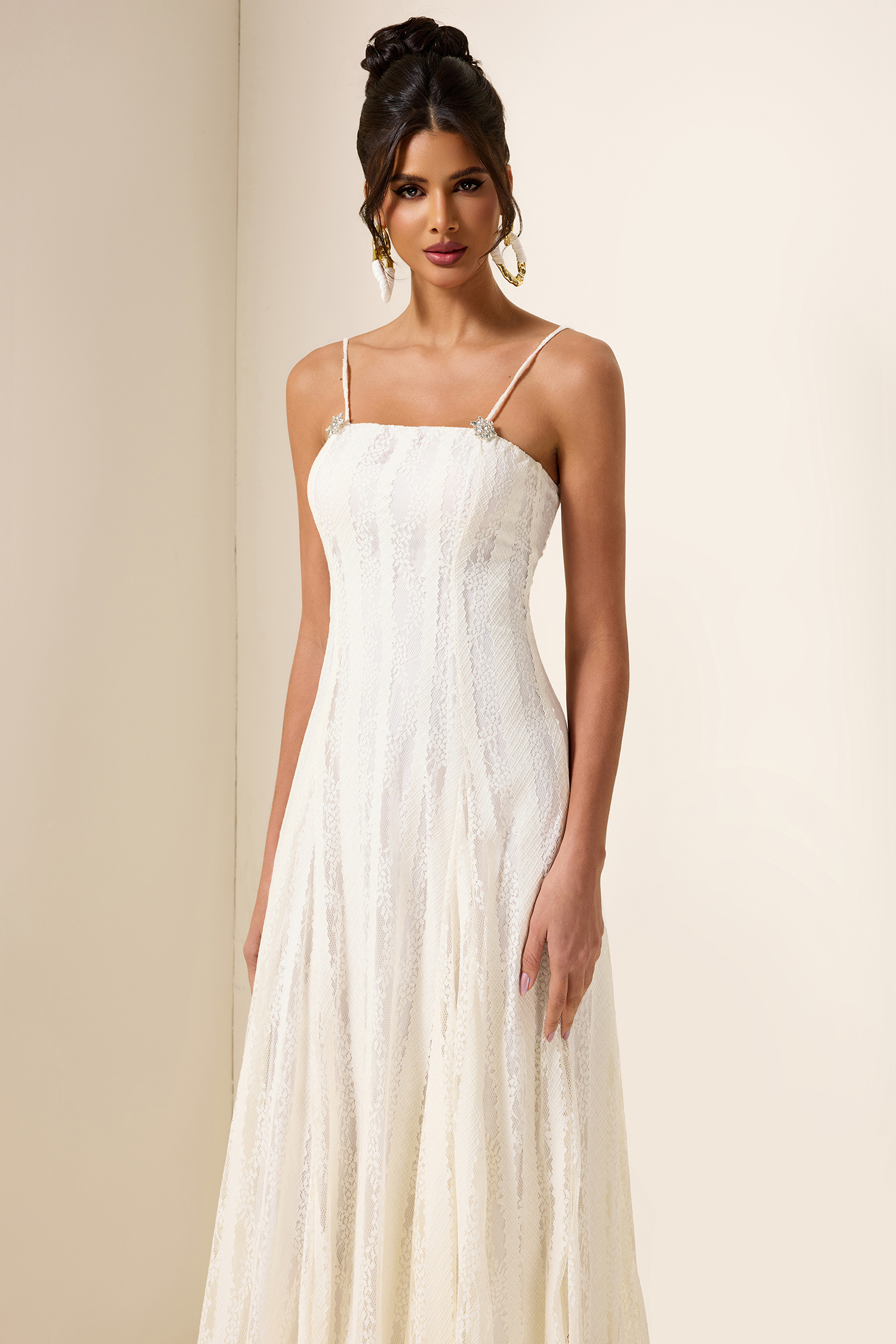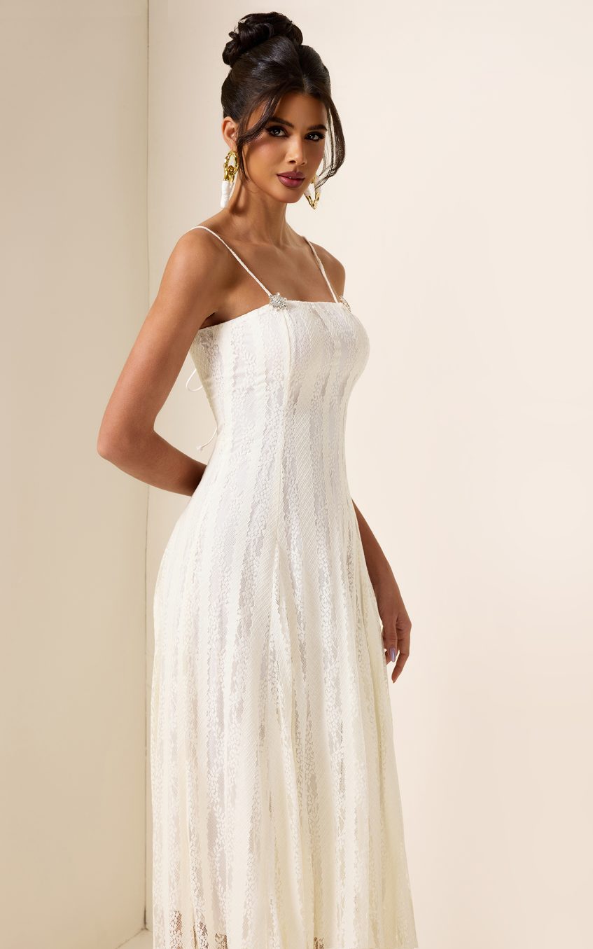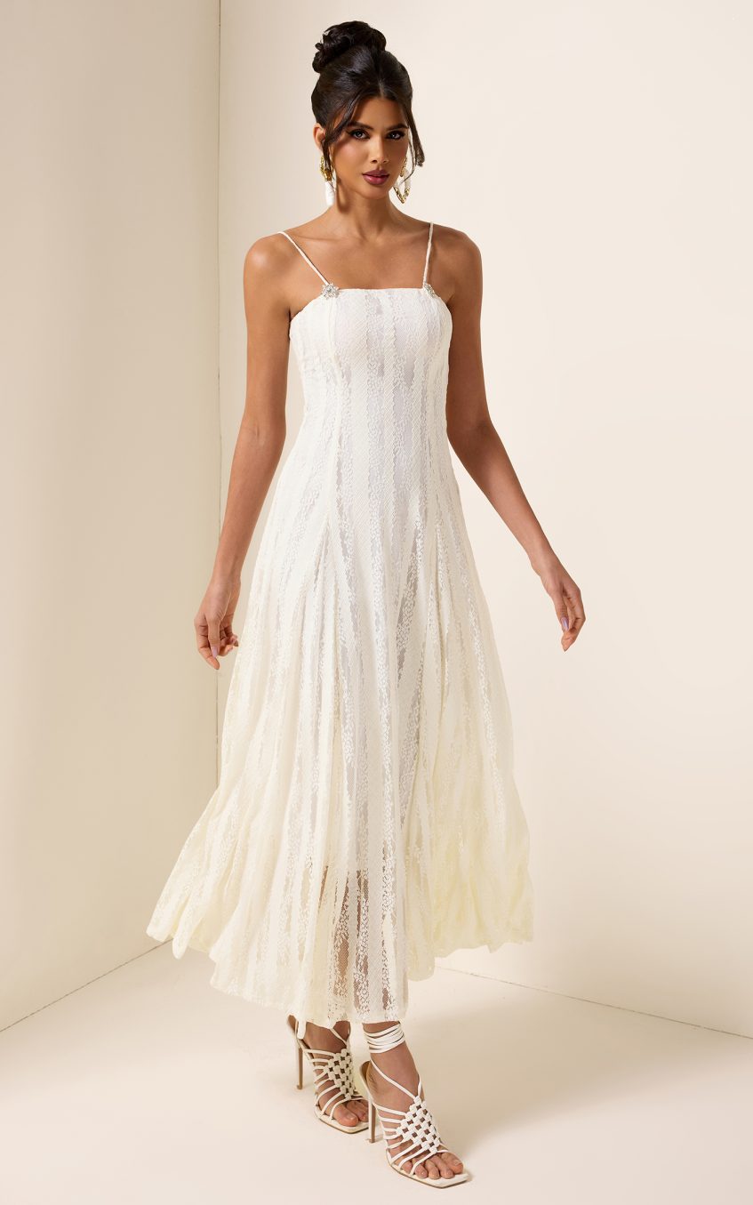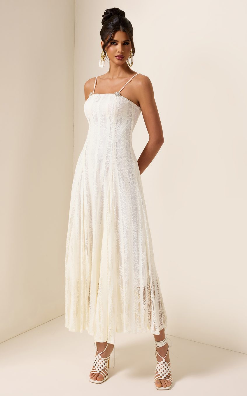 - Sleeveless. solid color. white. lace. midi dress