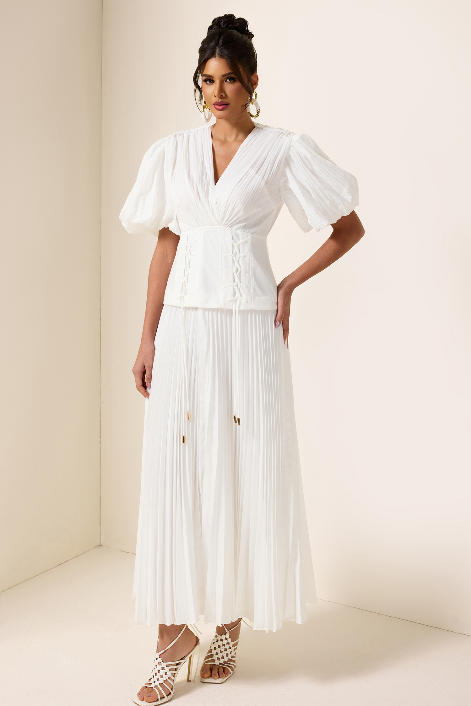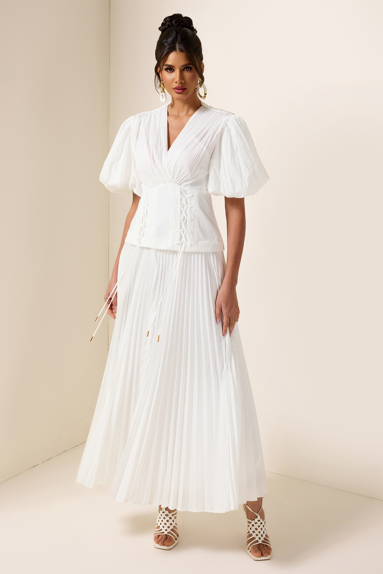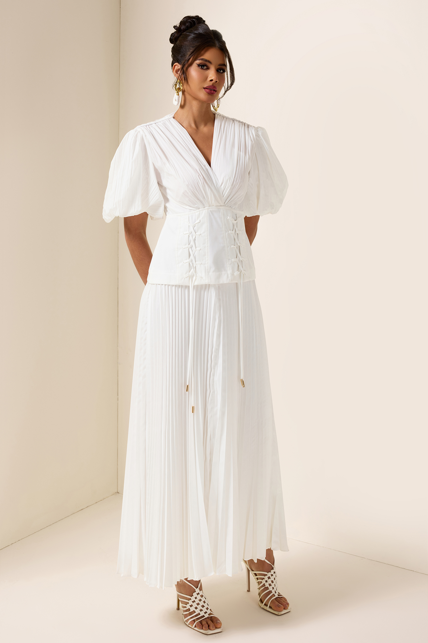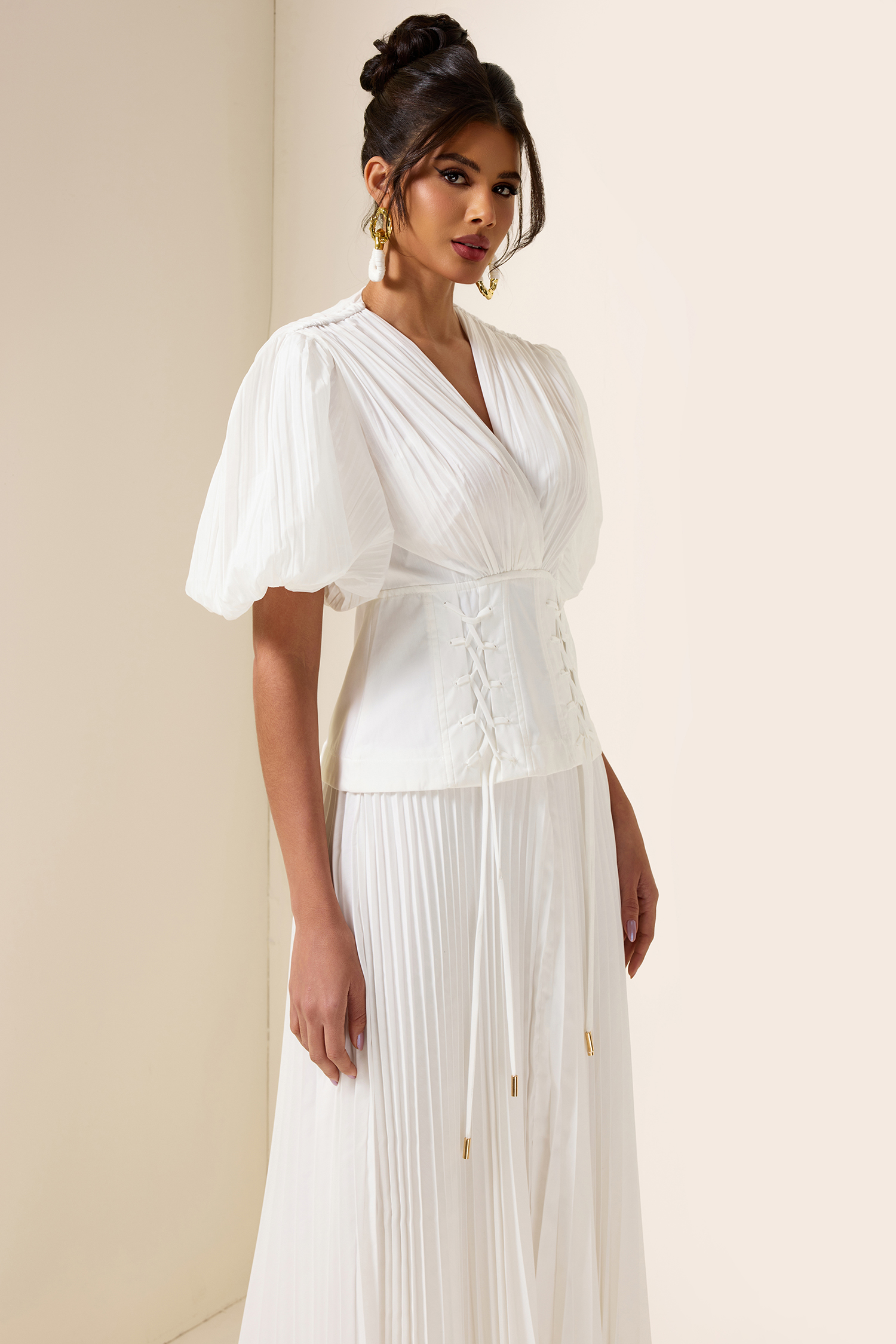 - Short sleeve. solid color. white. pleated. lace-up. midi dress