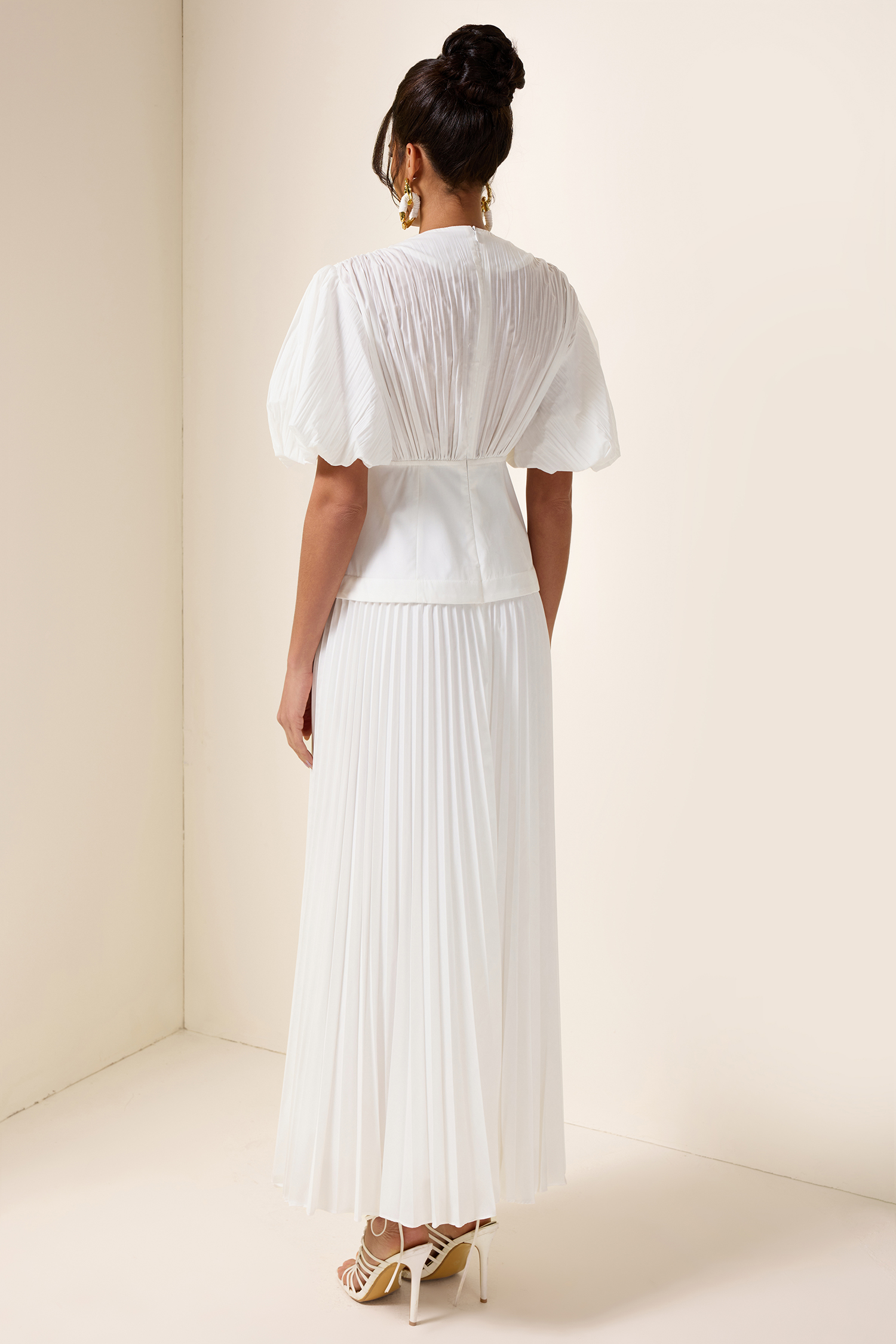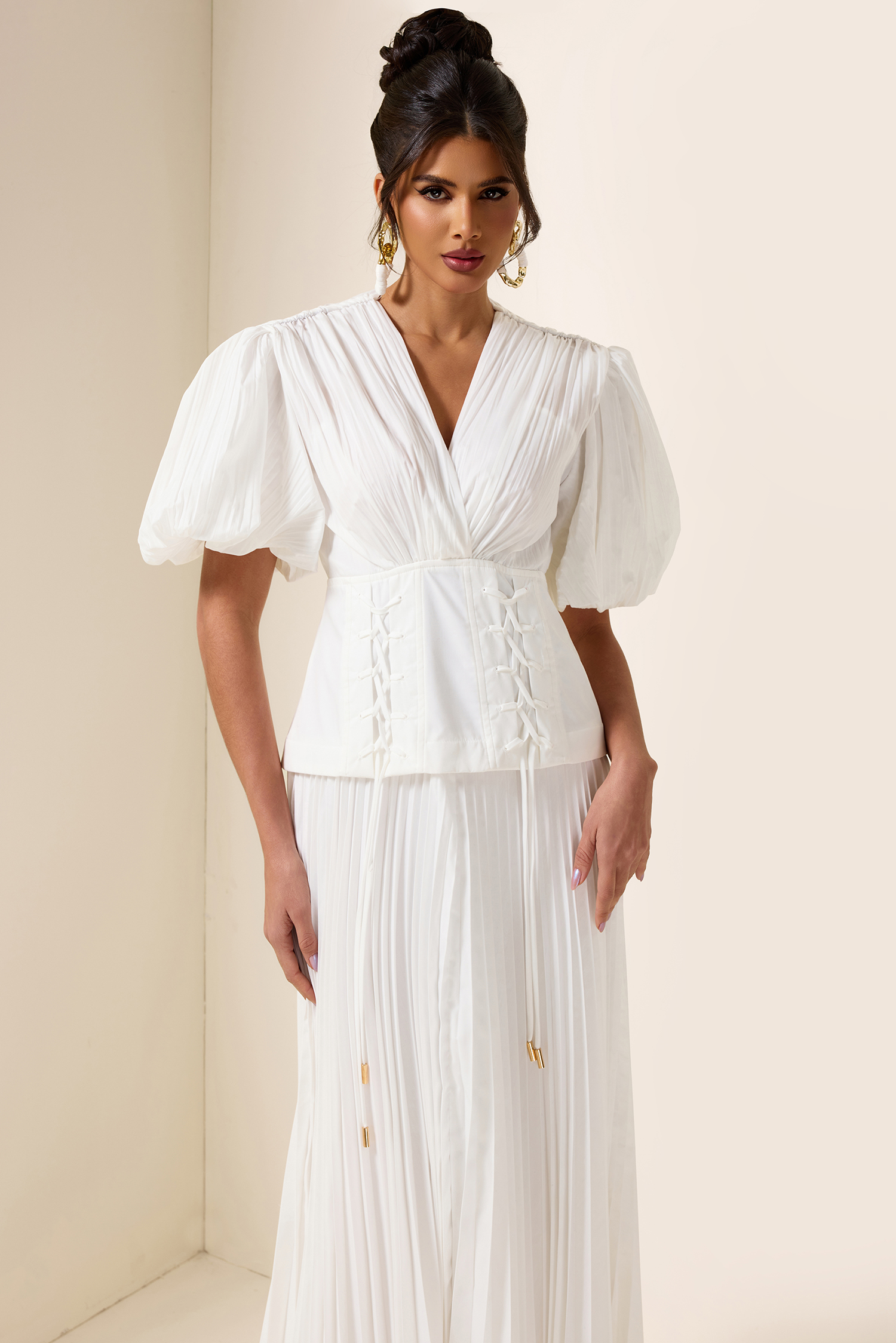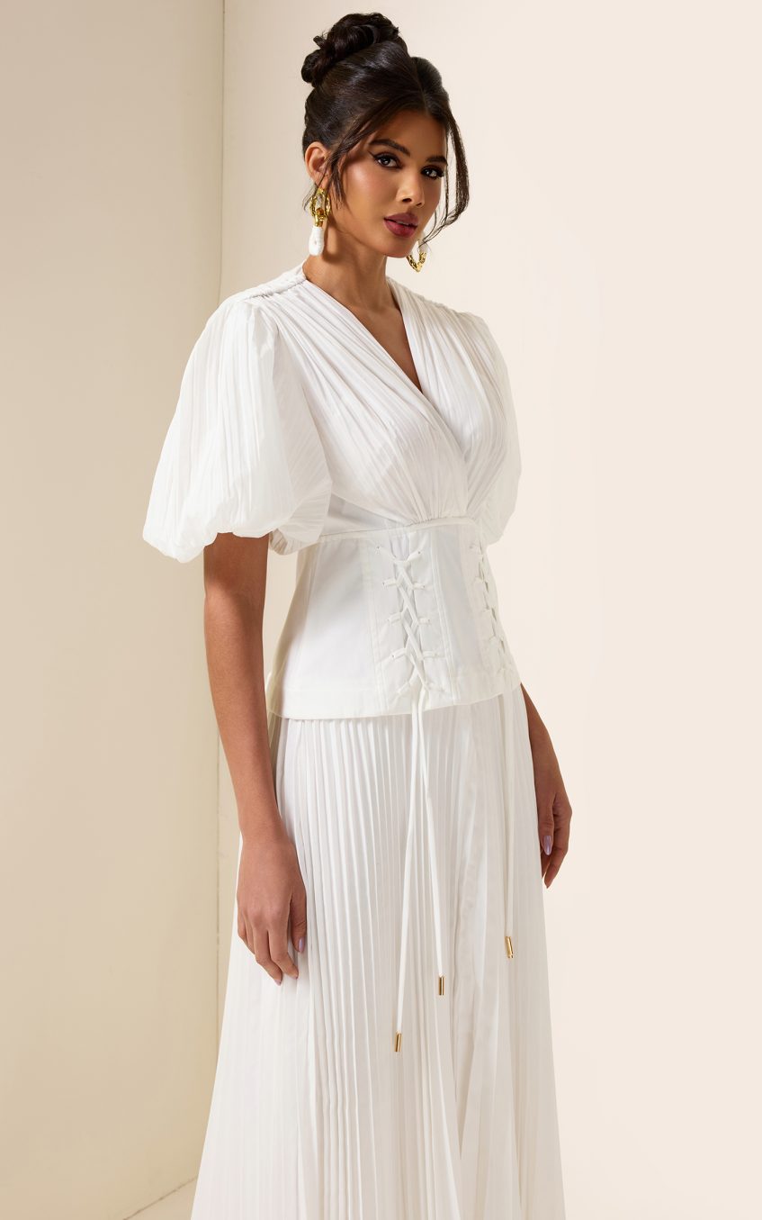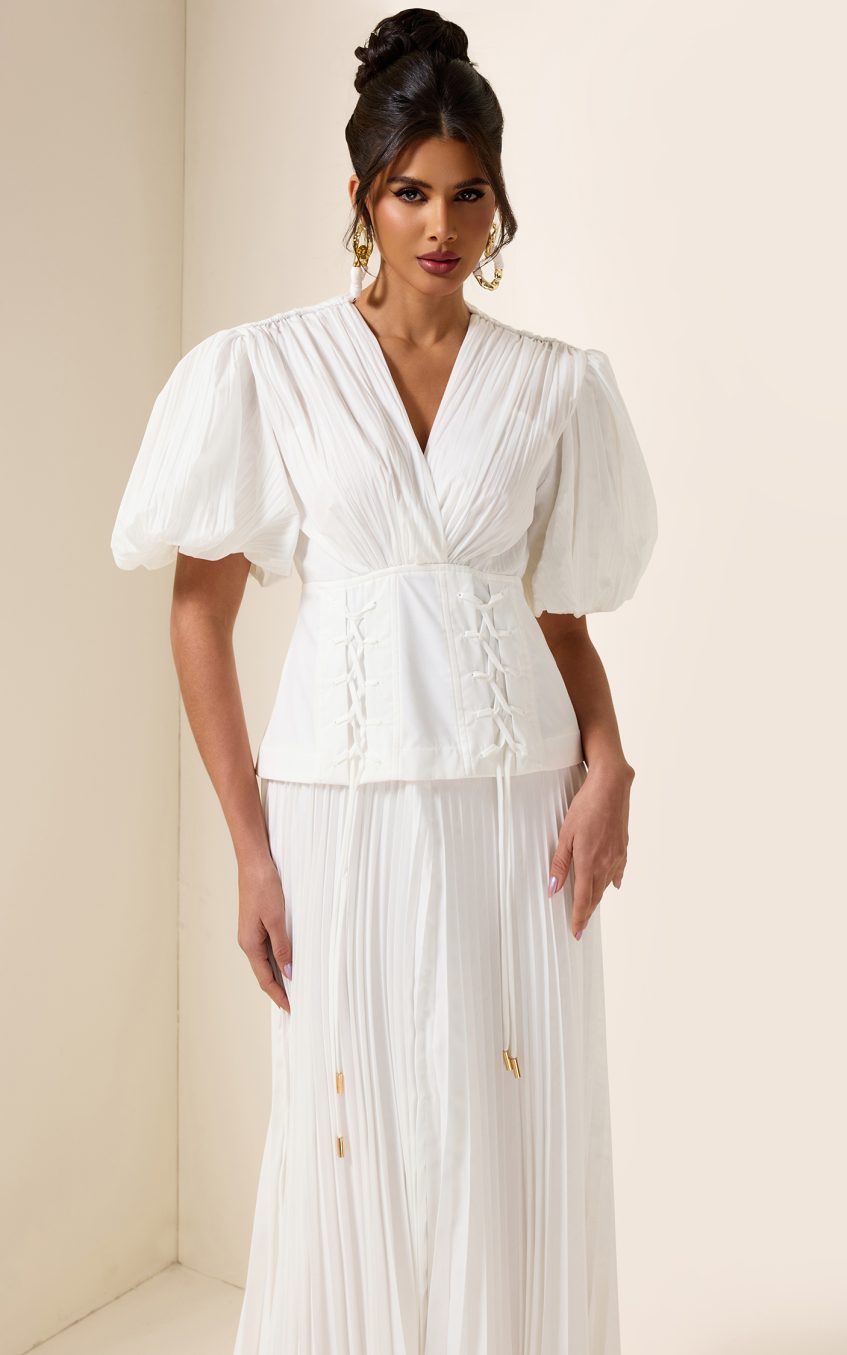 - Short sleeve. solid color. white. pleated. lace-up. midi dress