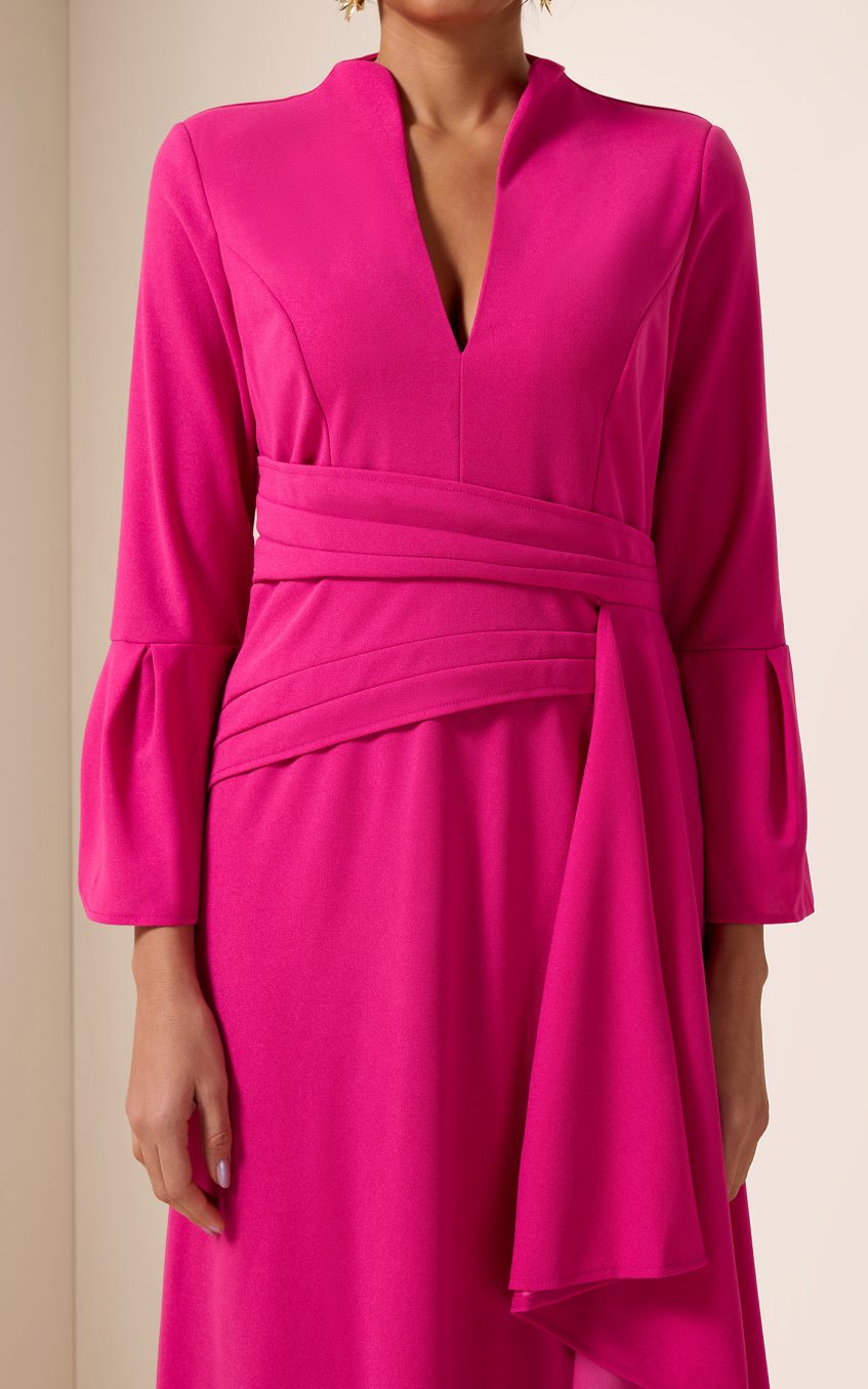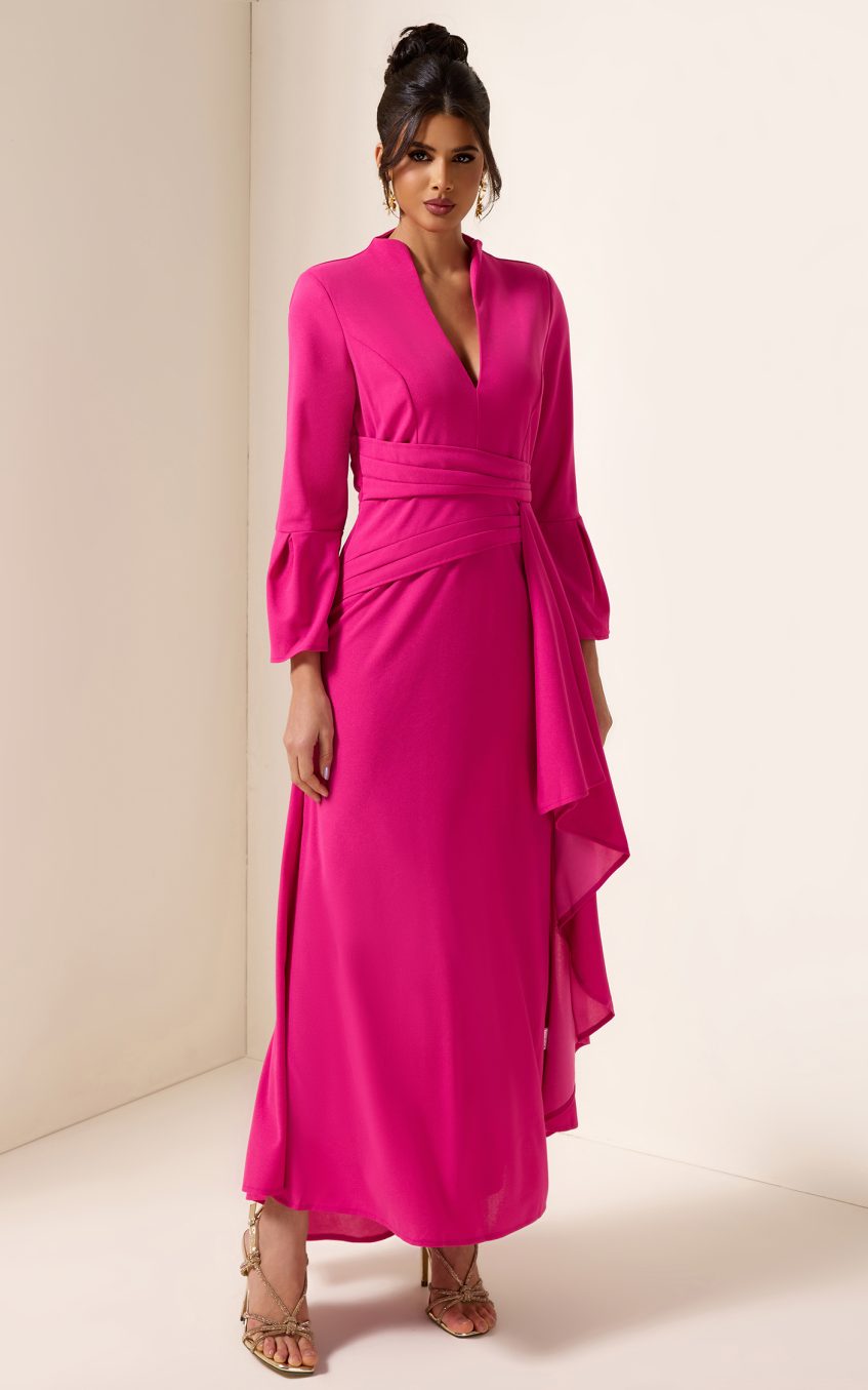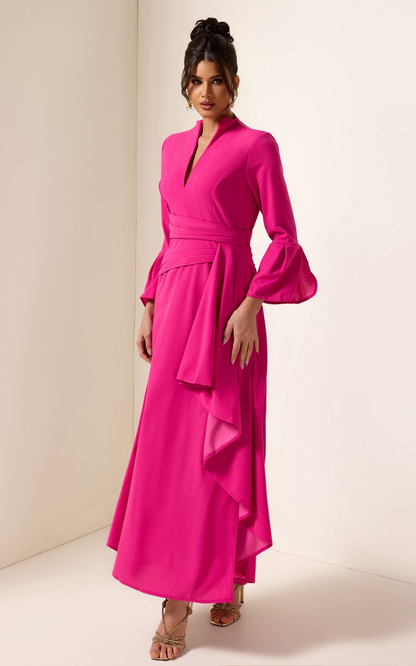 - Long sleeve. solid color. purple. pleated. split. midi dress