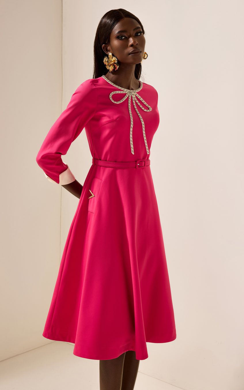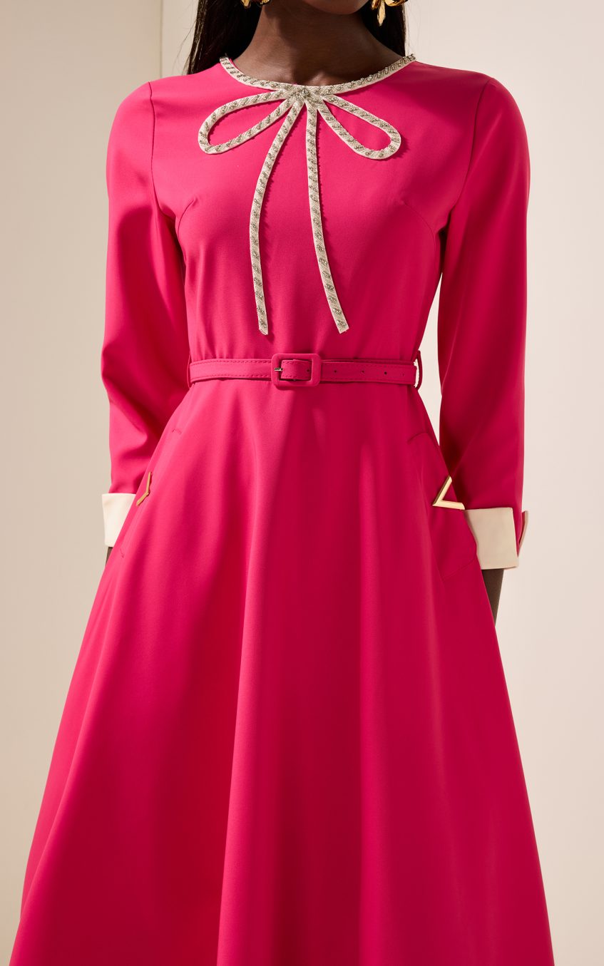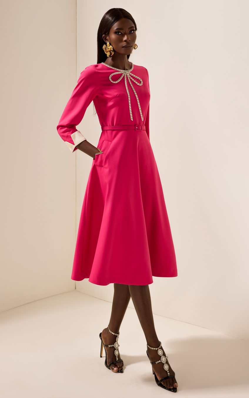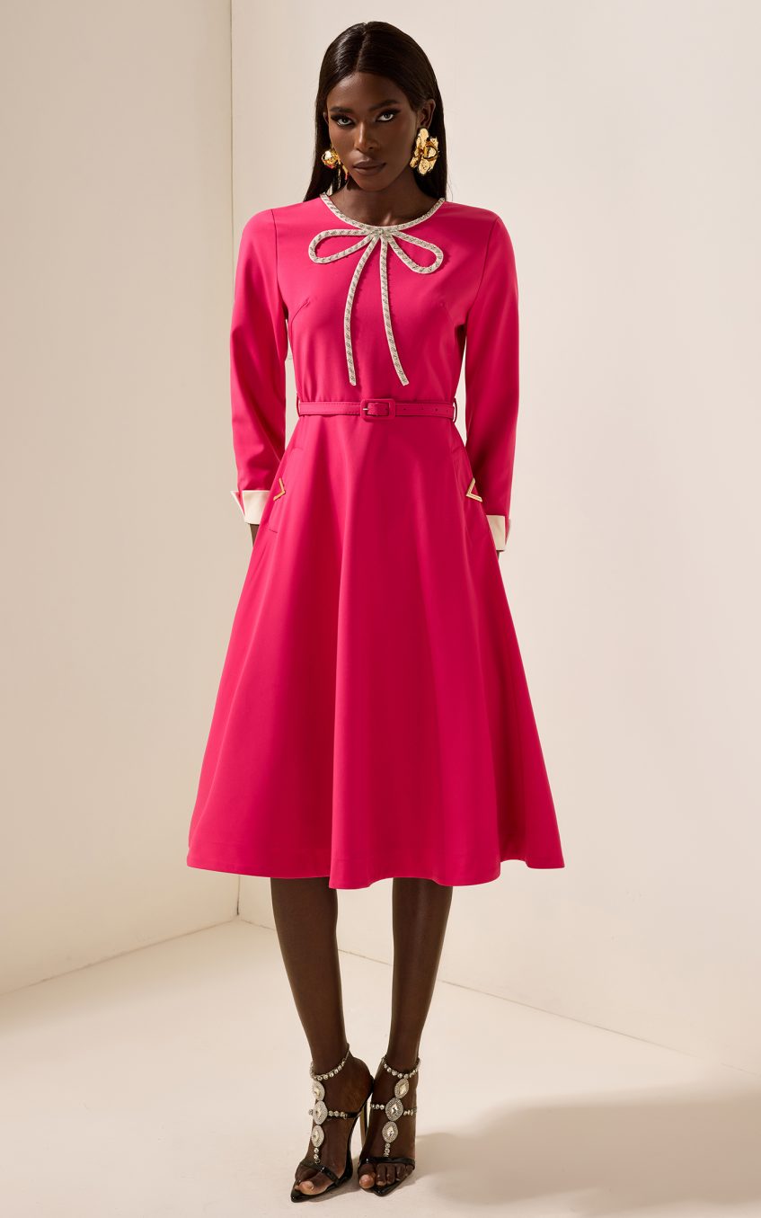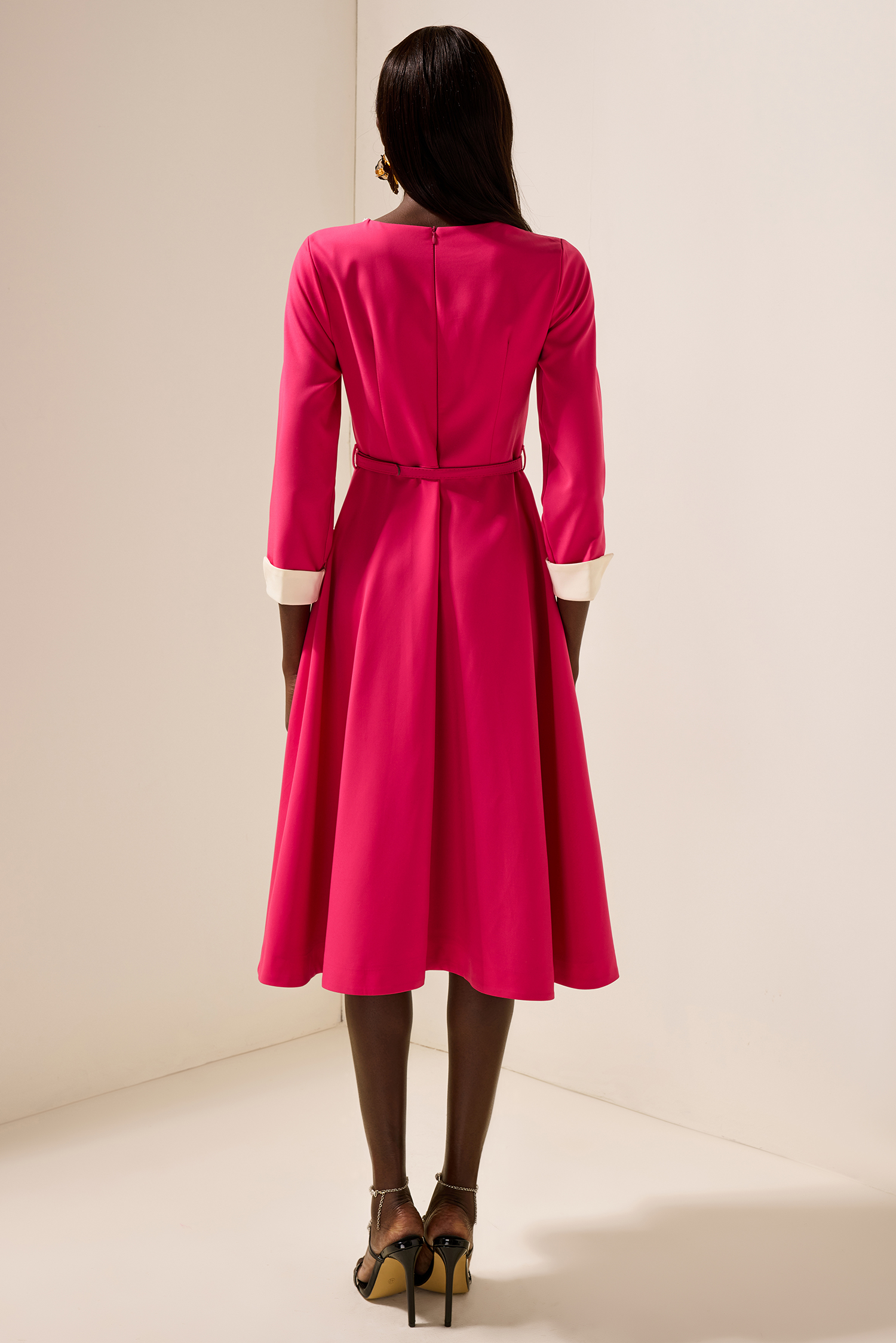 - Long sleeve. solid color. fuchsia. with belt. midi dress