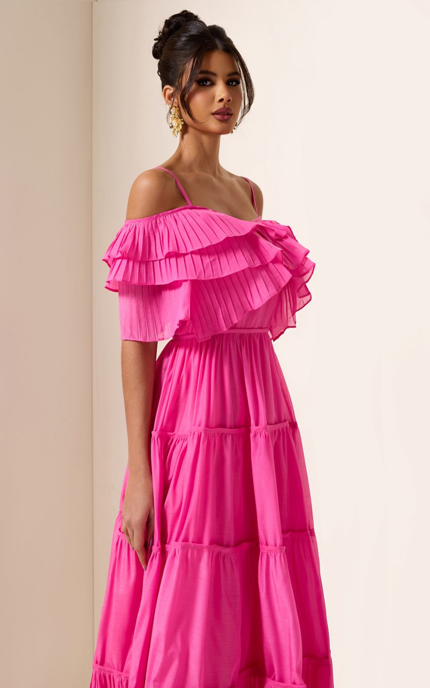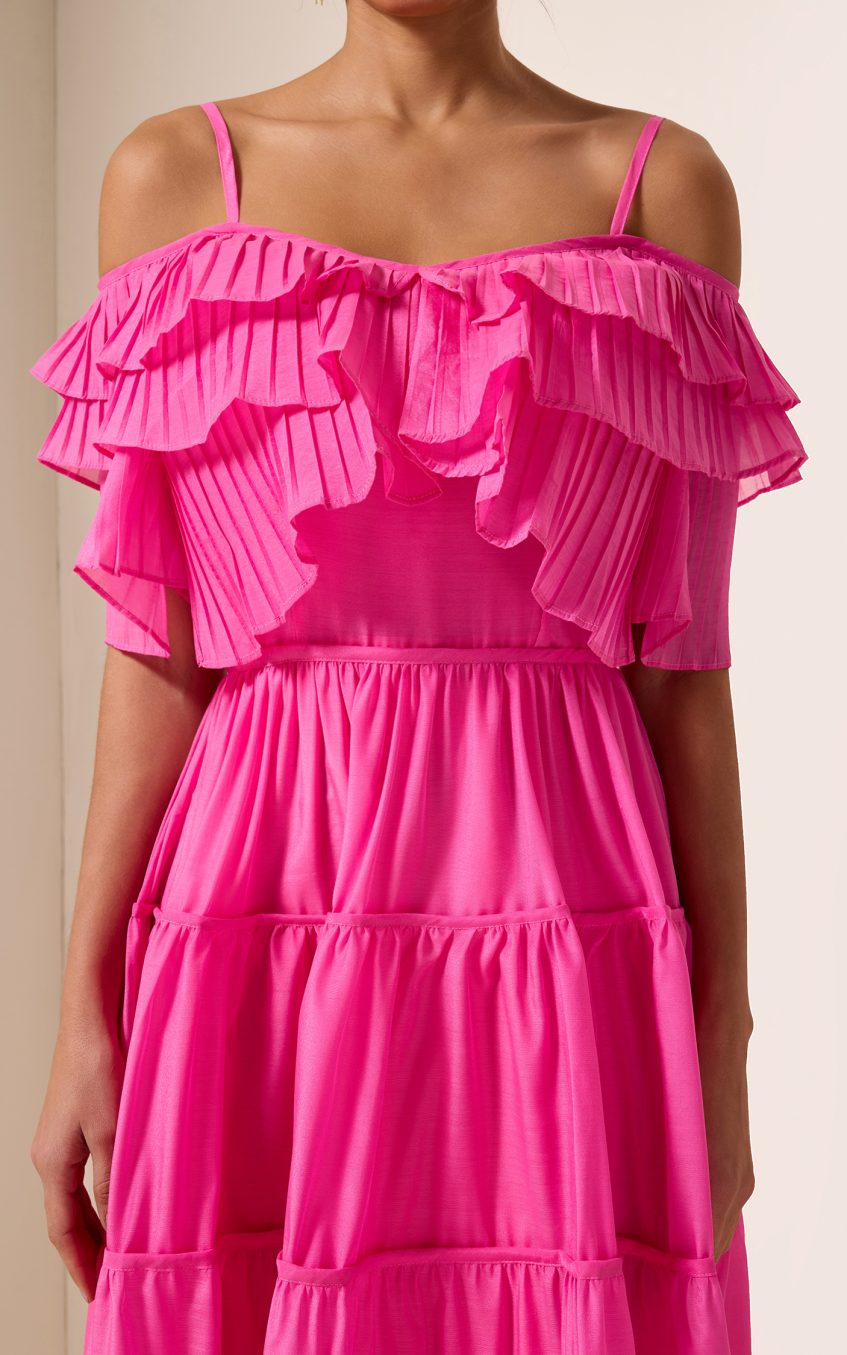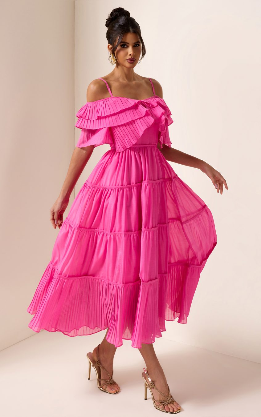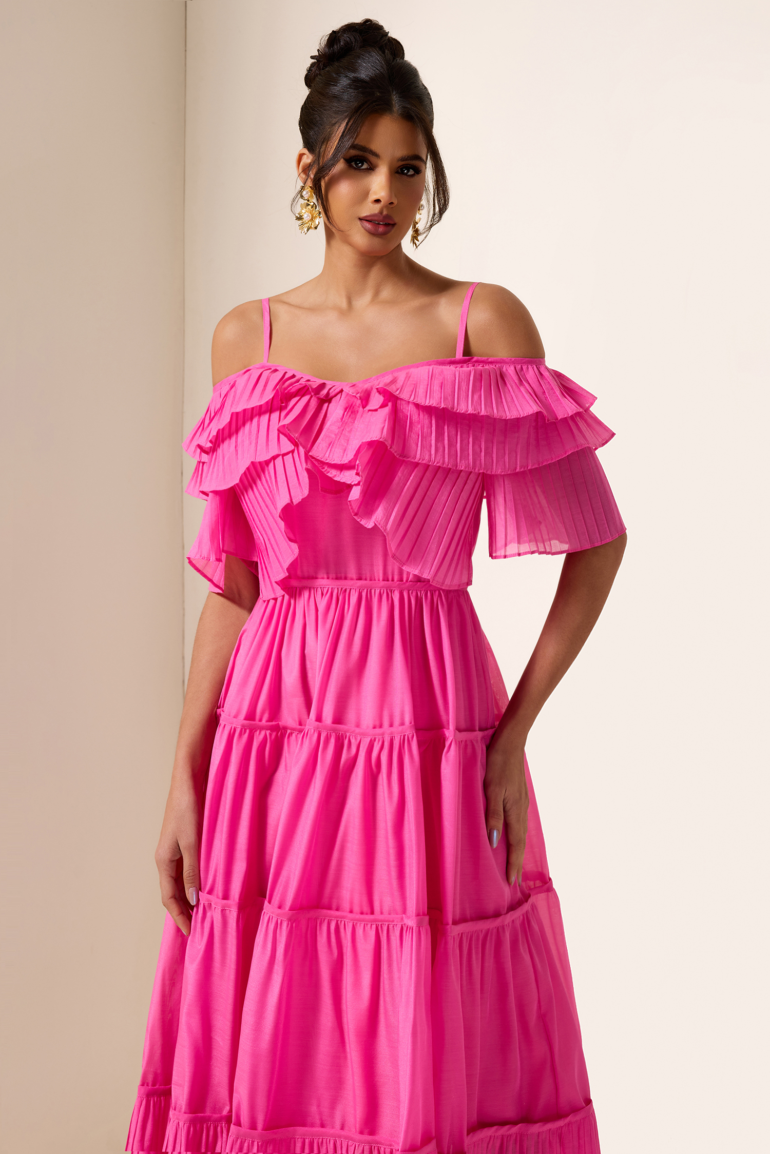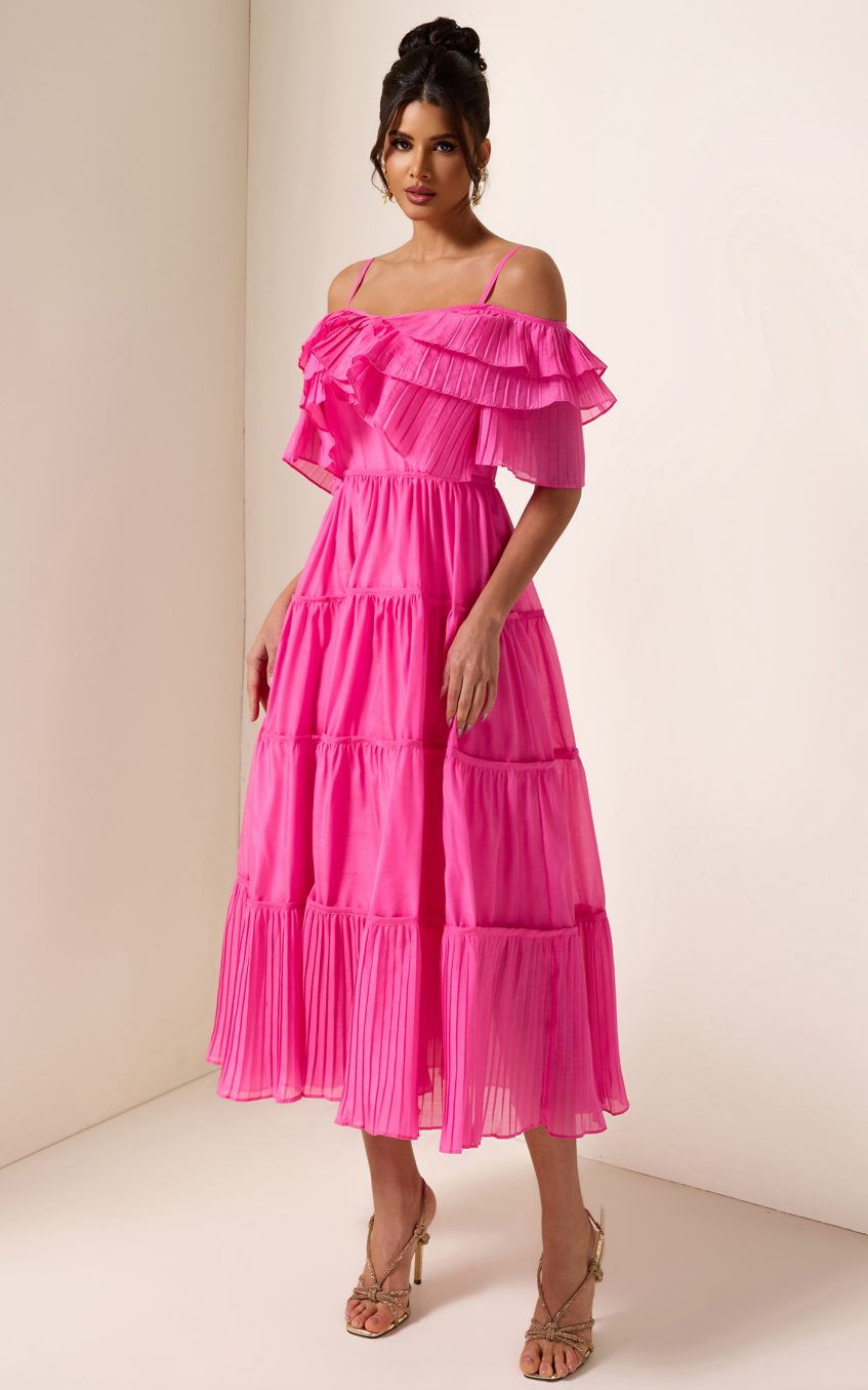 - Short sleeve. pink. solid color. ruffle. pleated. midi dress